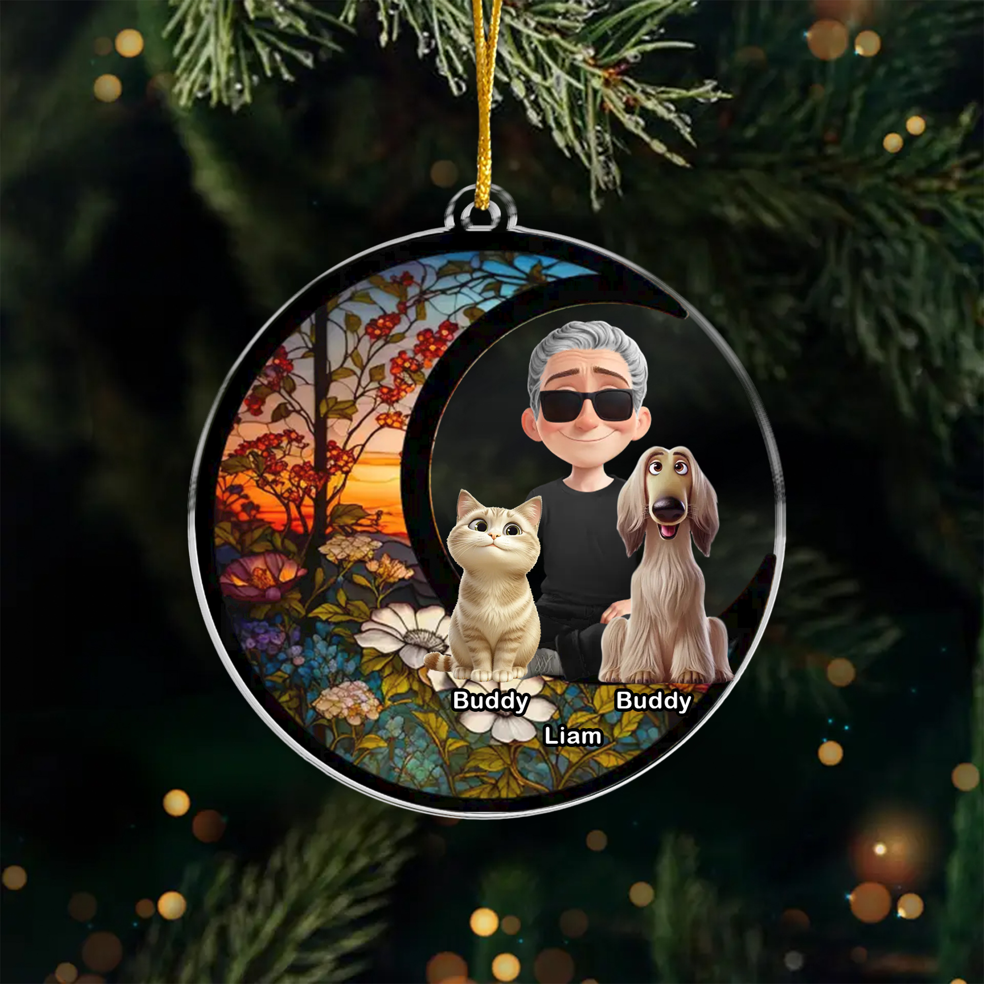 Personalized Man and Pets Christmas Ornament with Names Custom Moon Stained Glass Effect Keepsake Round Acrylic Style Holiday Gift for Pet Dad Dog Cat Lover Decoration-ASO-KQDTM
