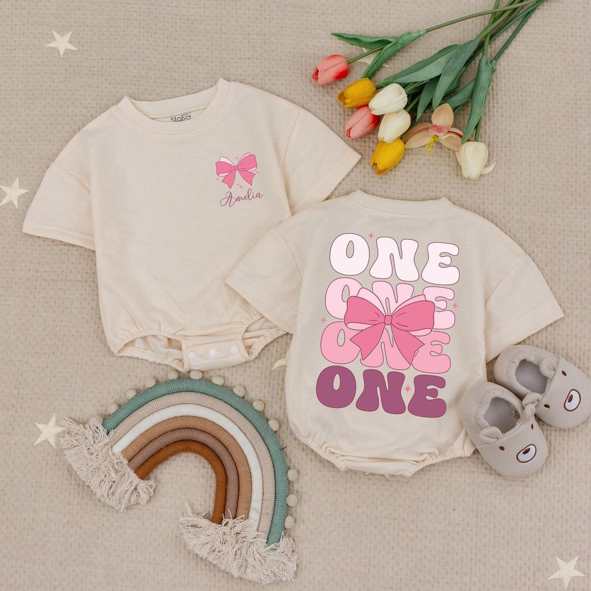 Custom Name Pink Bow 1st Birthday Baby Romper Baby Girl First Birthday Outfit Cute Pink Birthday Bod