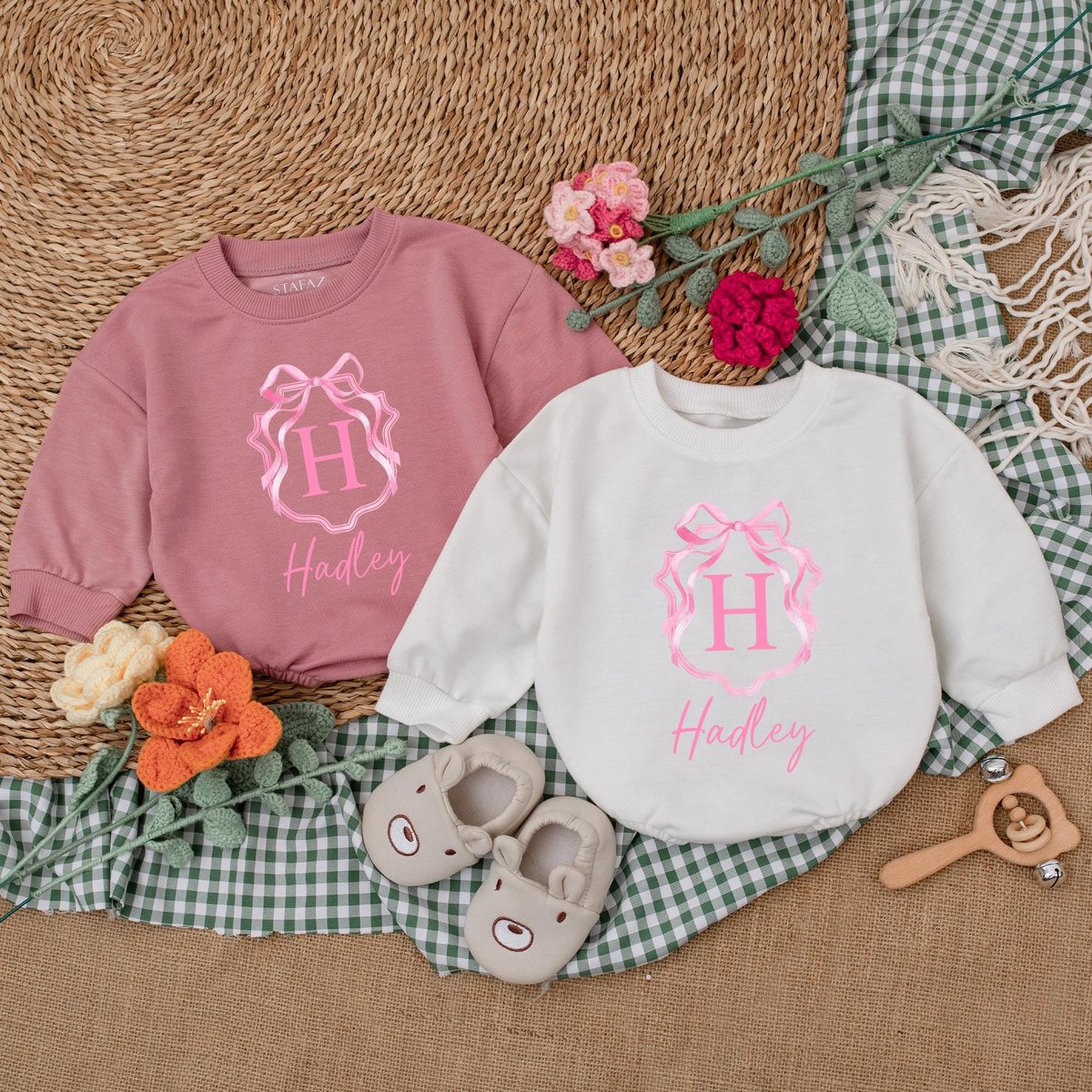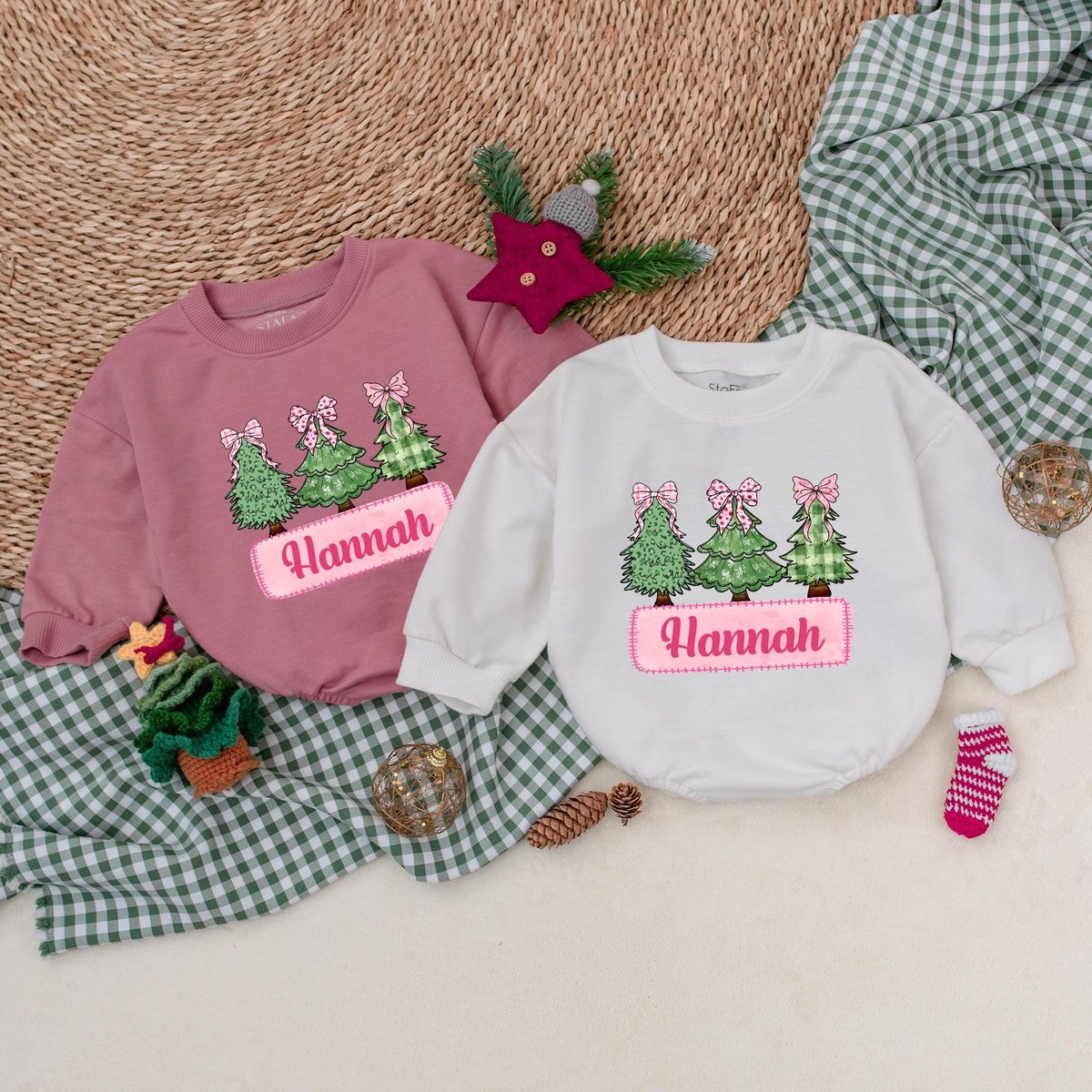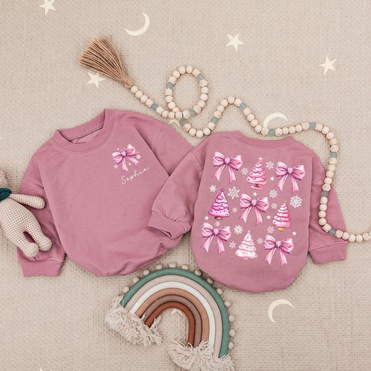 Custom Name Pink Bow Cute Christmas Romper Sweatshirt Pink Bow Baby Girl Clothes First Christmas Bab