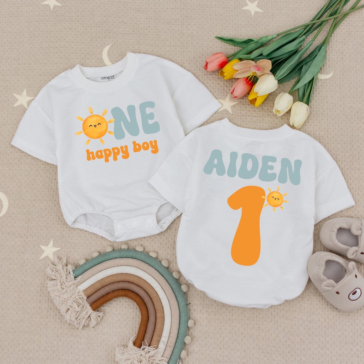 Custom Name Sun First Birthday Baby Romper One Happy Boy First Birthday Babysuit Sun Birthday Theme