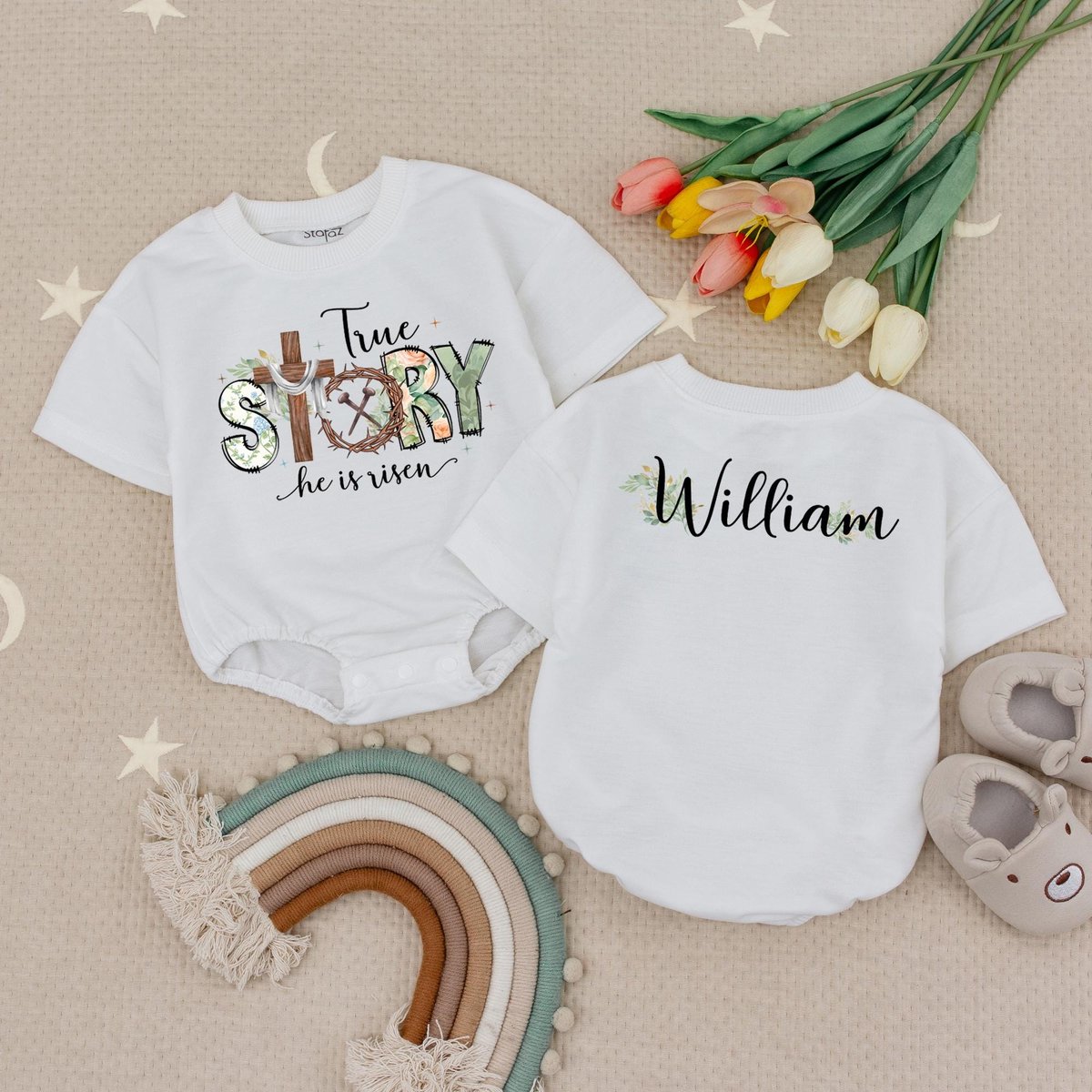 Custom Name True Story Easter Baby Bodysuit He is Risen Baby Gift Jesus Christian Easter Bubble Romp
