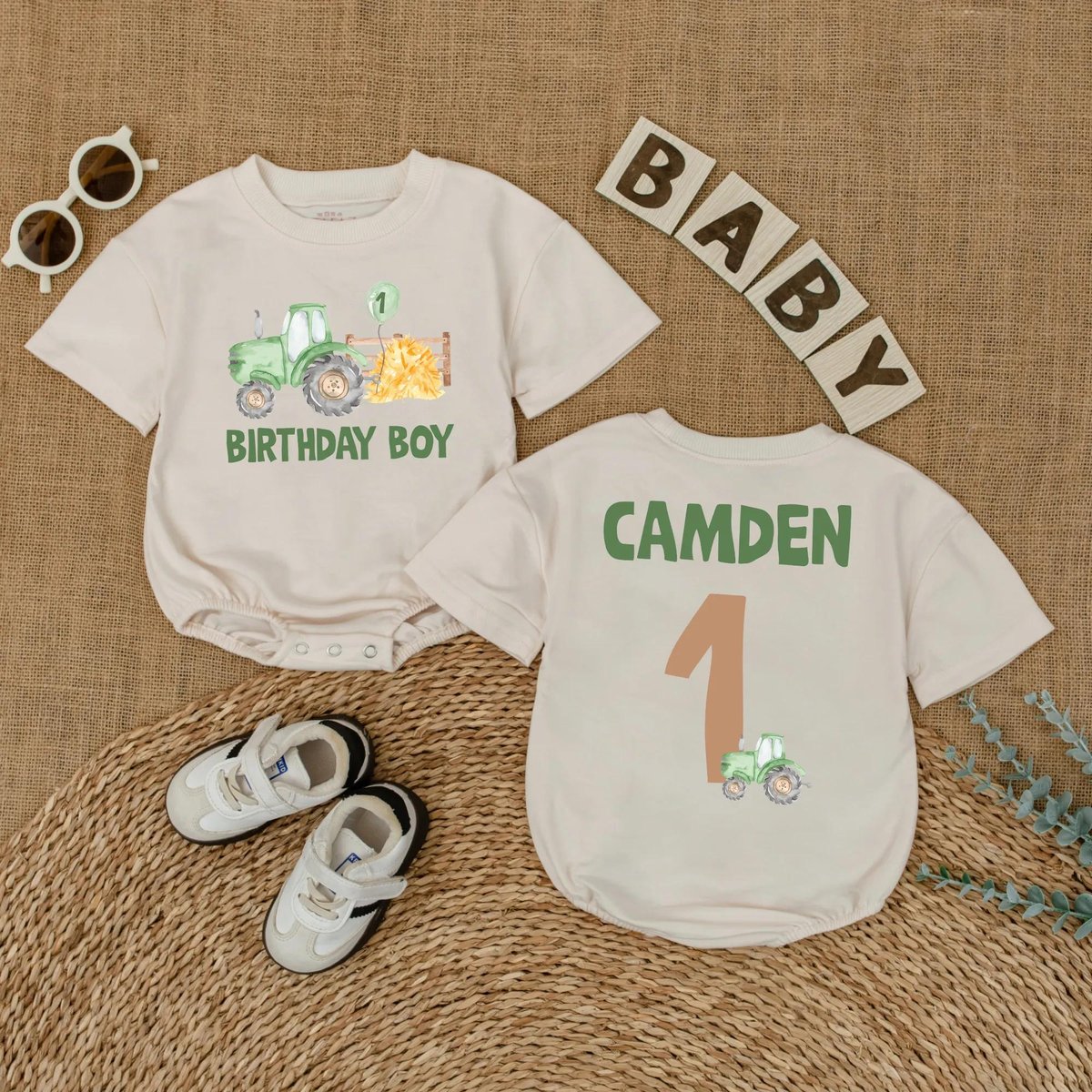 Personalized Green Tractor Birthday Baby Romper Farm Theme Baby Outfit for First Birthday Boys Birth 430