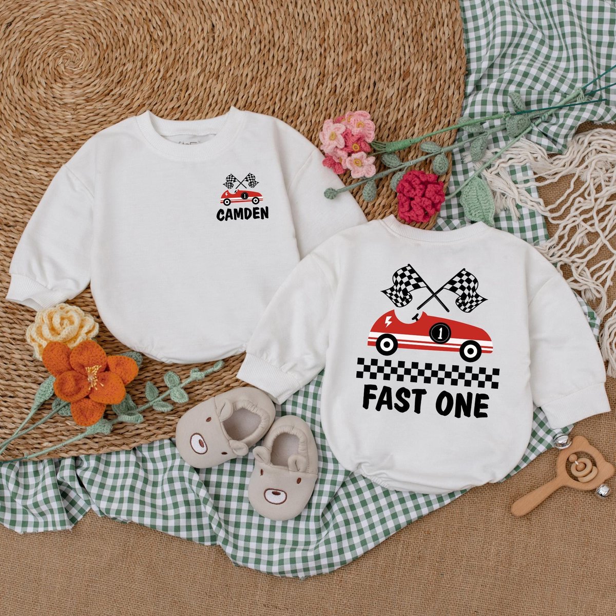 Personalized Fast One 1st Birthday Romper Checkered Flag Birthday Bodysuit Race Car Outfit Romper fo 171