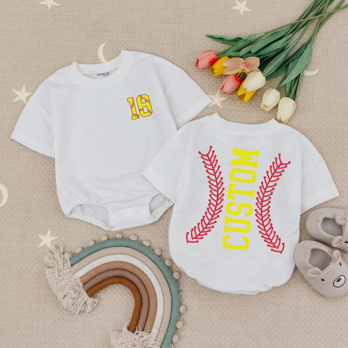 Custom Your Name and Number Softball Baby Romper Bow Softball Baby Romper Softball Mama Baby Bodysui