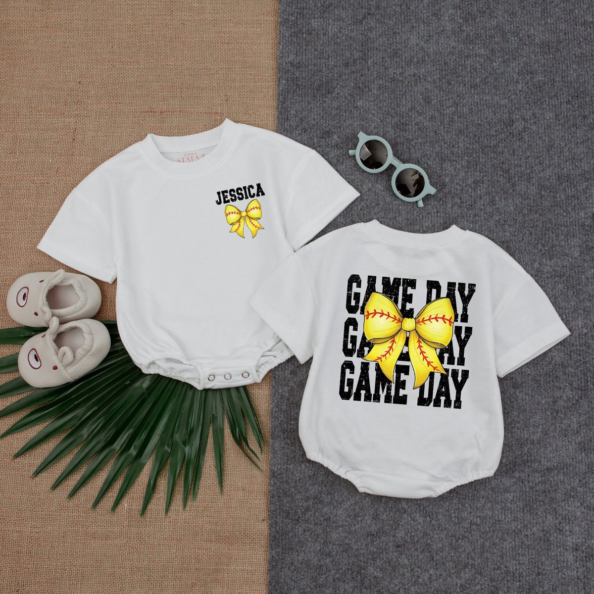 Personalized Softball Baby Romper Softball Season Retro Softball Bow Baby Softball Game Day Romper B 179