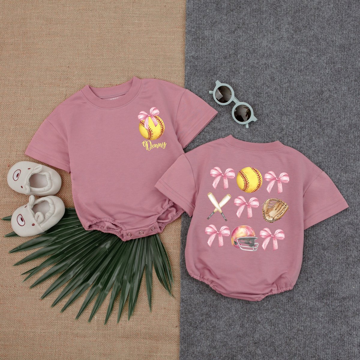 Personalized Softball Bow Bubble RomperSoftball Pink Bow BirthdayGame Day Baby ClothesBaby ClothesSh 178