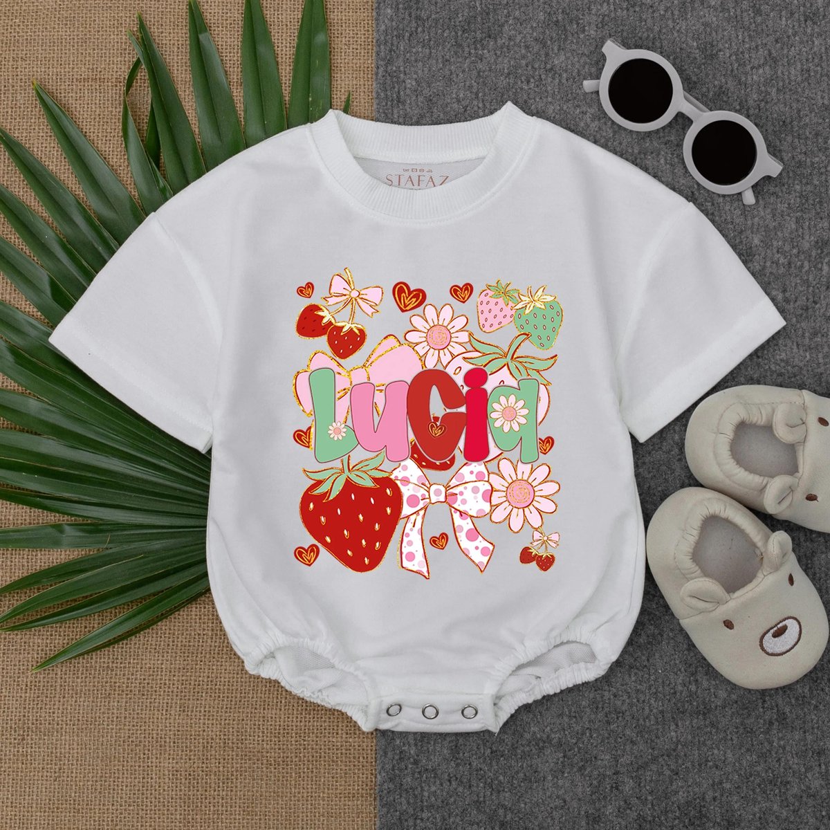 Personalized Strawberry Name T shirt Bubble Romper Baby Girl Clothes Infant Outfit with Bow Baby Gif 431