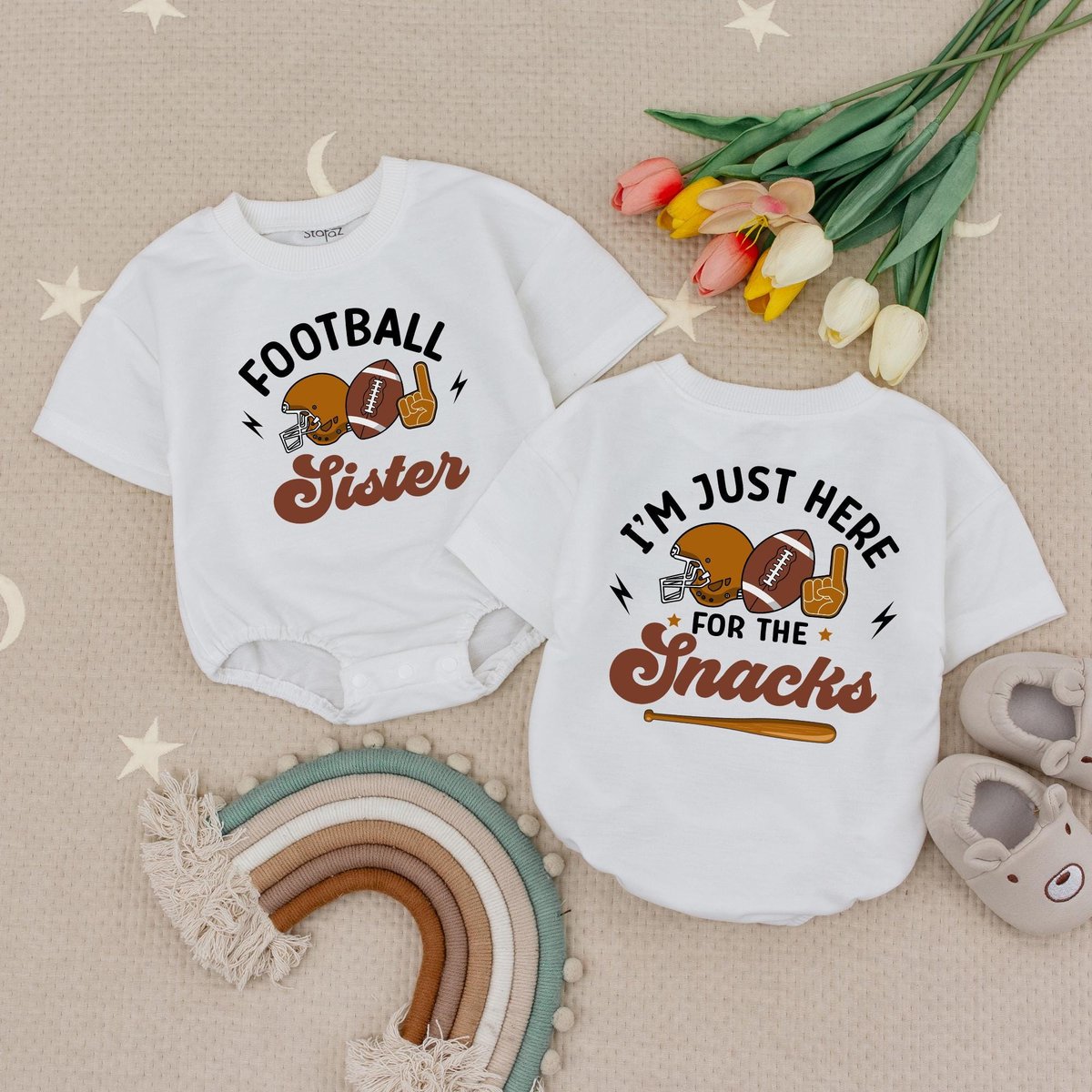 Cute Sister Football Bubble Romper I’m Just Here For The Snacks Babysuit Kids Football Babysuit Kid