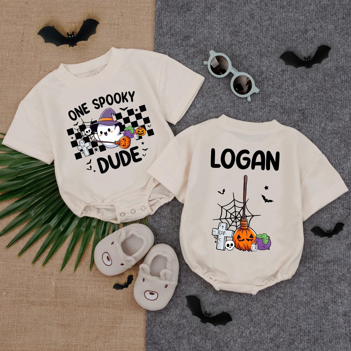 Personalized One Spooky Dude Romper Spooky Season Baby Gift Custom Kids’ Name Tee First Halloween B 434