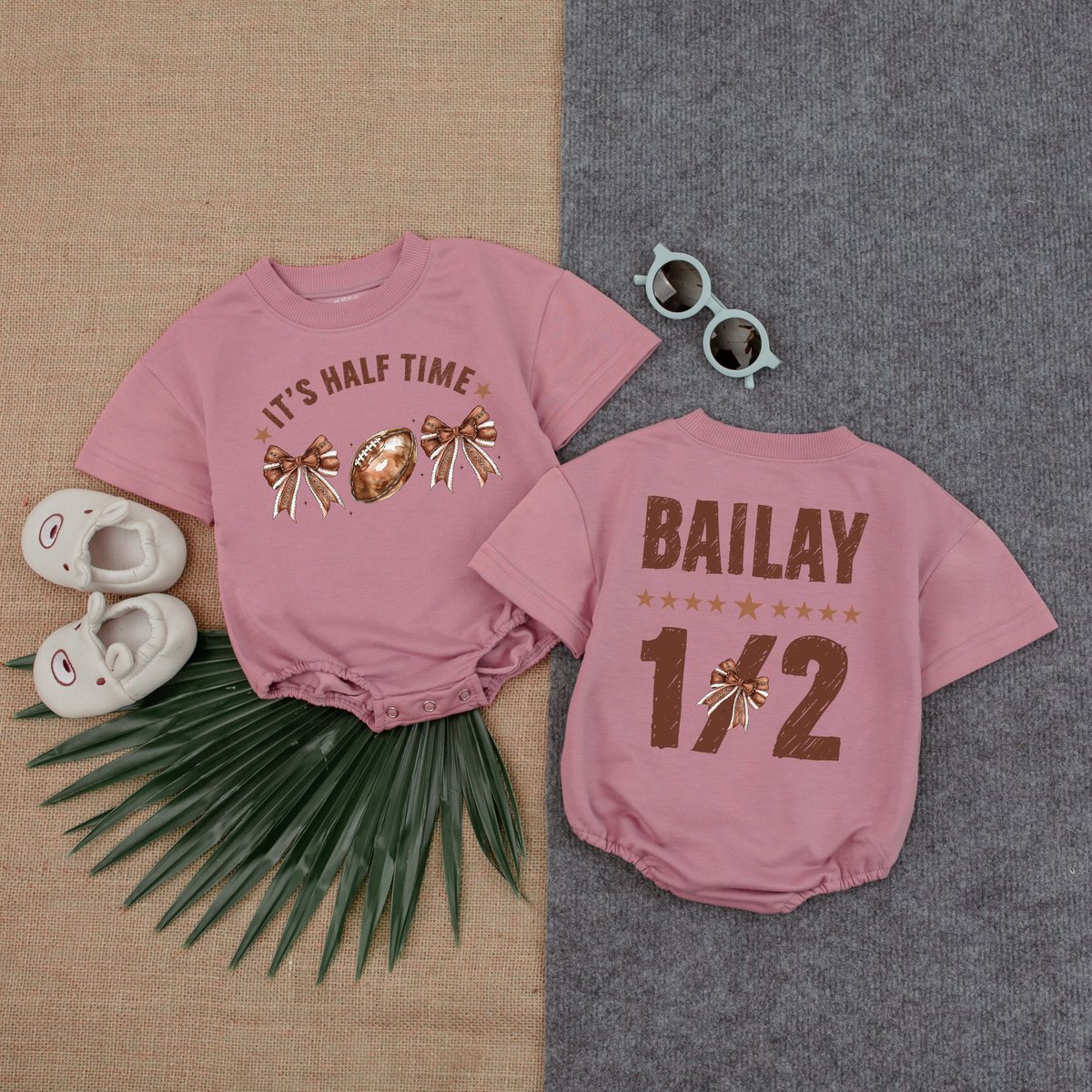 Personalized It’s Halftime Bubble RomperGirly Bow Football Half Birthday12 Birthday Outfit Football 177