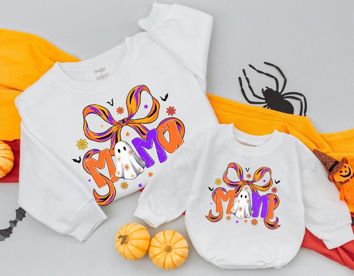 Mama and Mini Bow Halloween Sweatshirts Fall Mommy and Me Sweaters Halloween Matching Shirts Retro H 436