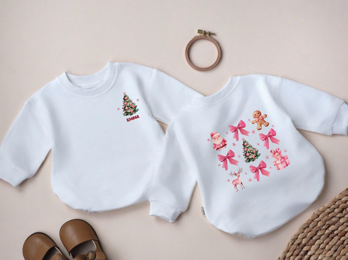 Personalized Coquette Pink Christmas Rubble Romper Sweatshirt Custom Cute Pink Bow Christmas Newborn 436
