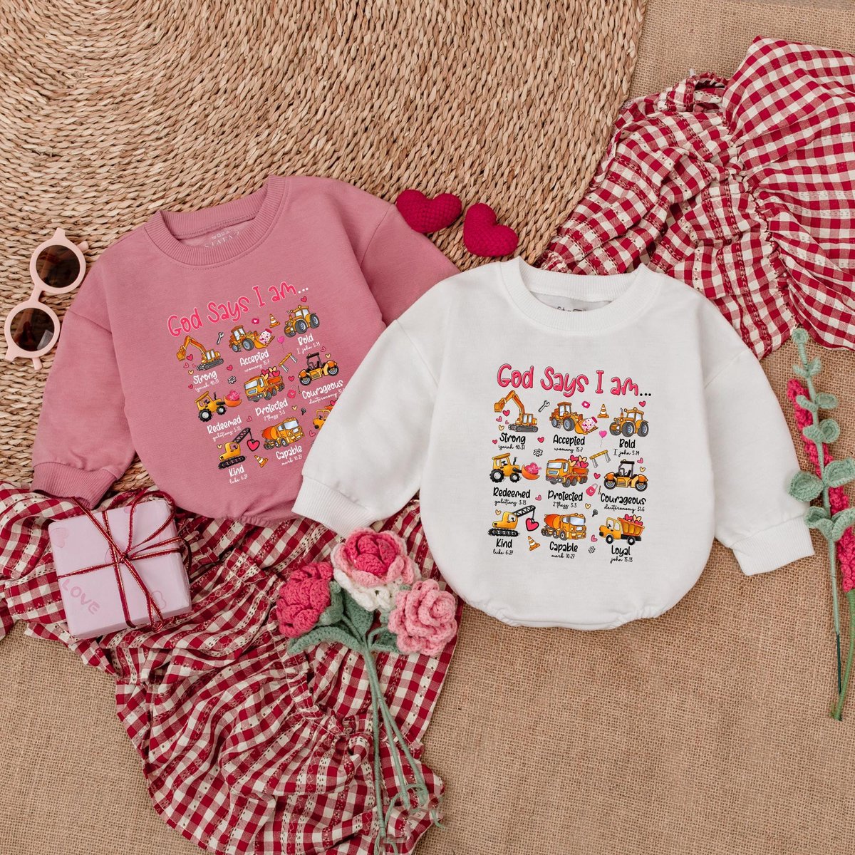 God Says I am Valentine Construction Romper Boys Valentines Baby Bodysuit Bubble Romper My 1st Valen 183