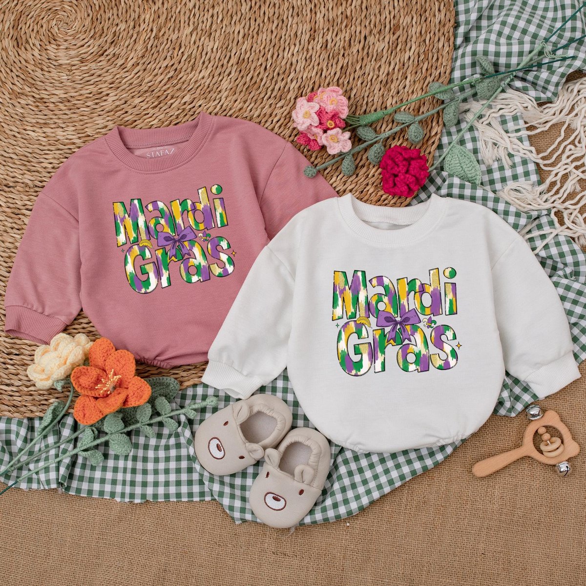 Mardi Gras Bow Baby Romper Cute Mardi Gras Bodysuit Mardi Gras Baby Girl Outfit Sweatshirt Bubble Ro 187