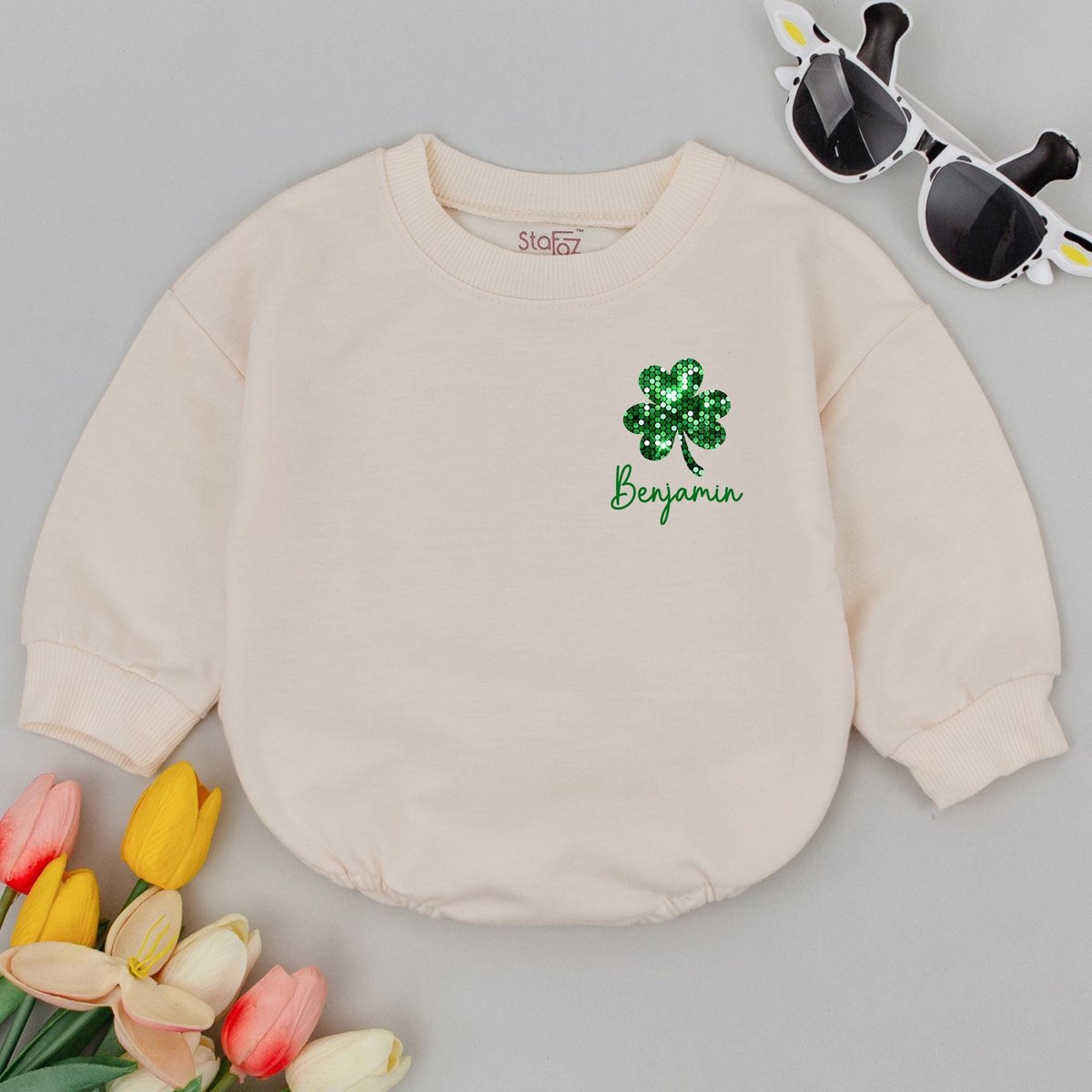 Personalized St. Patrick Day Clover Baby Romper Mix Sequin Real Glittery Sparkle Bling Bling Shamroc 184