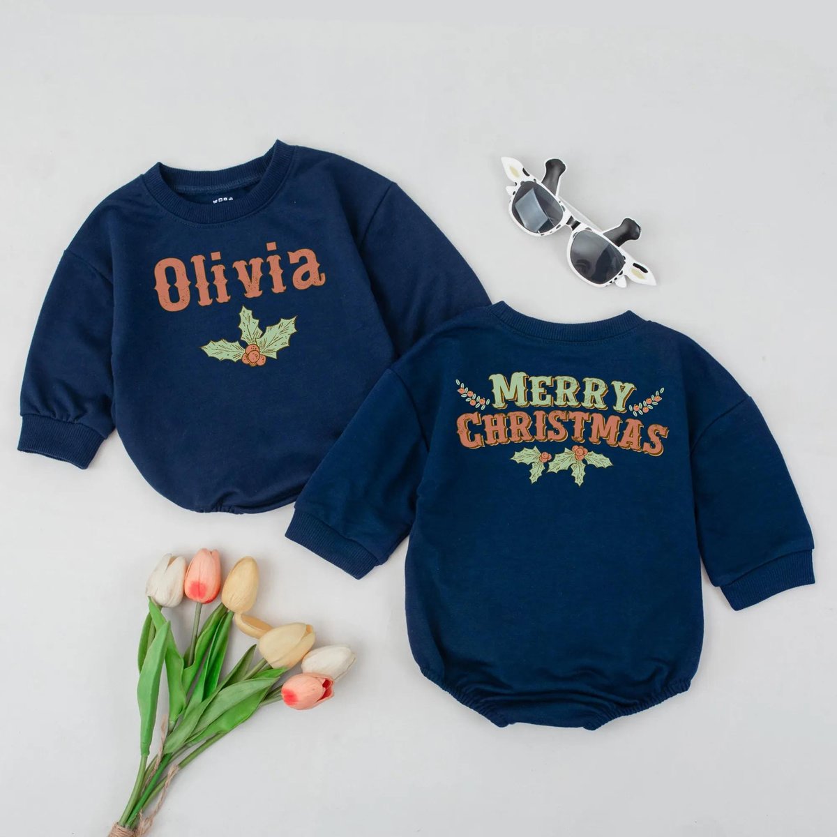 Personalized Merry Christmas Romper Retro Xmas Bodysuit Custom Western Christmas Baby Gift Vintage C 437