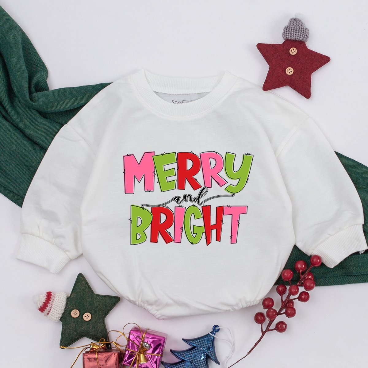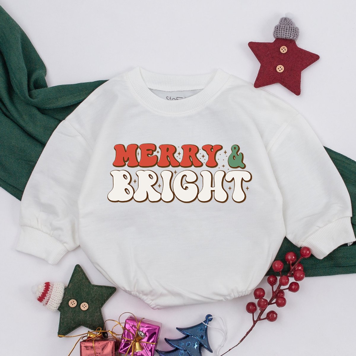 Merry and Bright Baby Romper Christmas Infant Clothes Baby Holiday Outfit Baby Sweatshirt Romper Bab 160