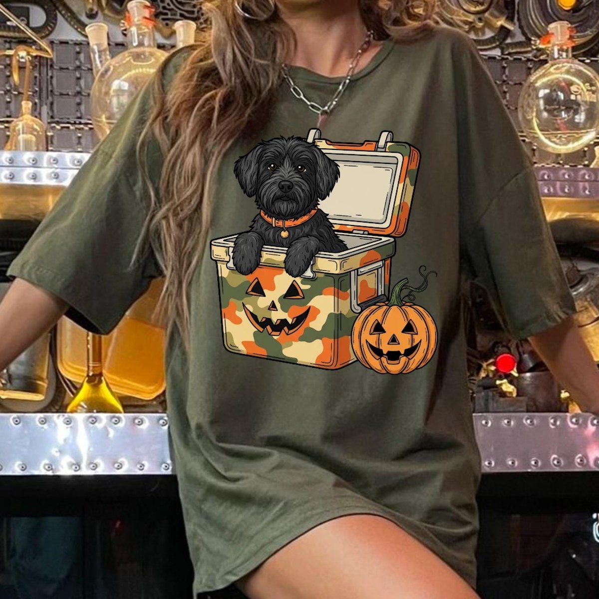 Black Dog in Camo Cooler PNG Halloween Puppy Clipart Digital Download with Jack O Lantern Sublimatio 434