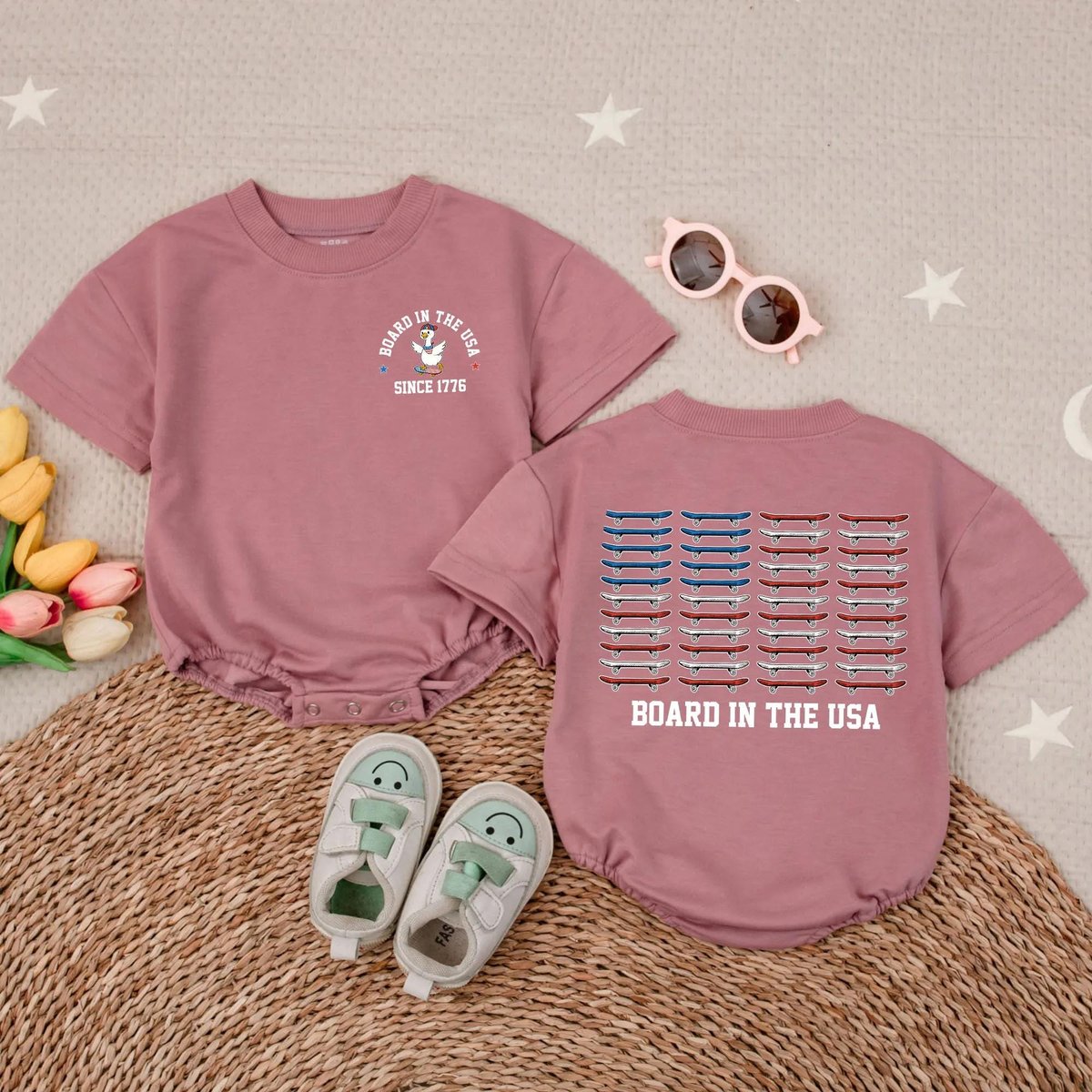 Board In The USA Bubble Romper Partriotic Summer Toddler Outfit Red White Blue Short Sleeve Clothes