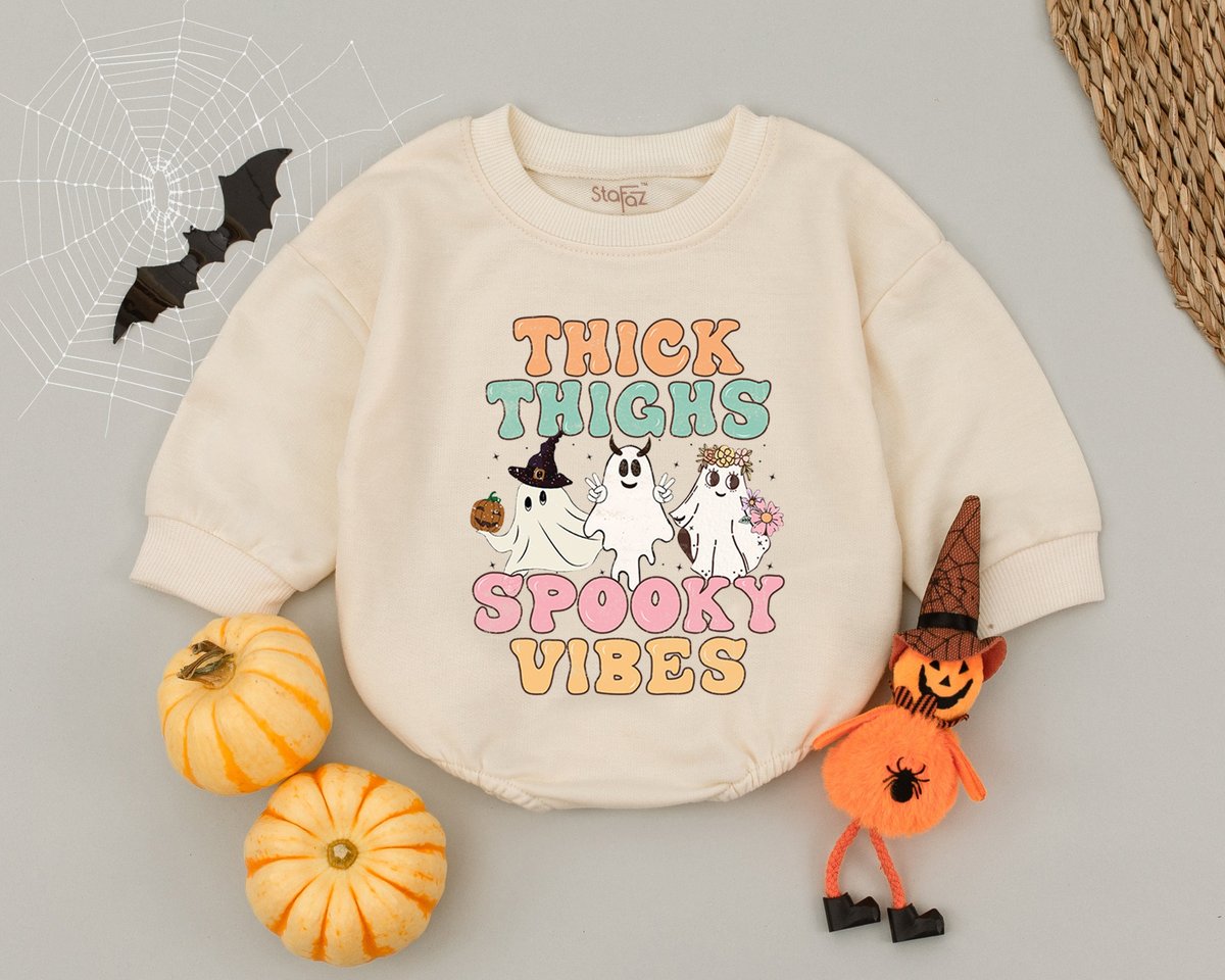 Thick Thighs Spooky Vibes Baby Romper Retro Ghost Halloween Baby Outfit Fall Baby Clothes Halloween