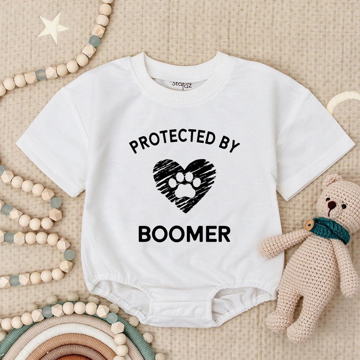 Personalized Protected By Dog Baby Romper Dog Lover Baby Romper Sweatshirt Pet Name Baby Clothes Dog