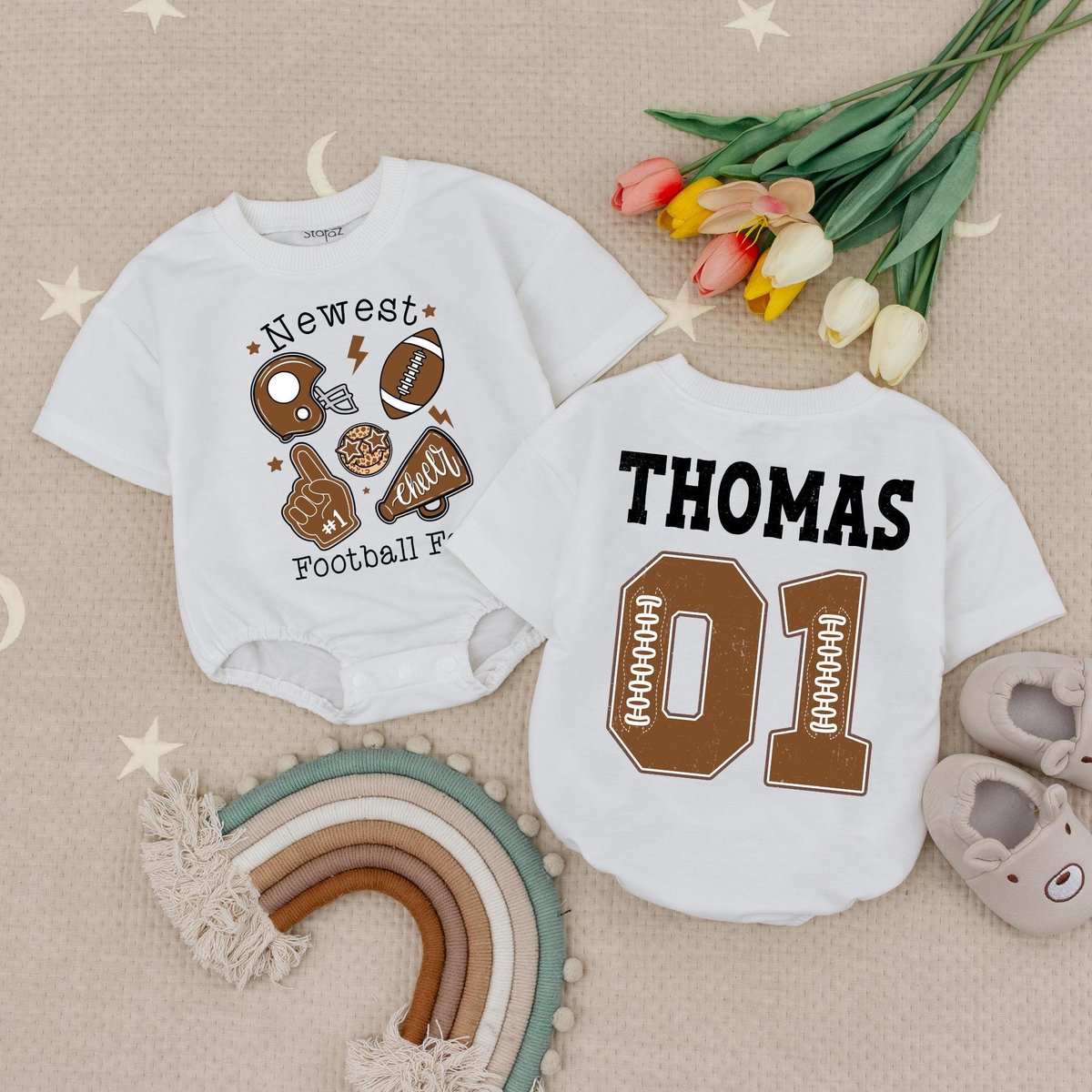 Personalized Name Newest Football Fan Baby Romper Custom Name and Number Game Day Baby Bodysuit Firs