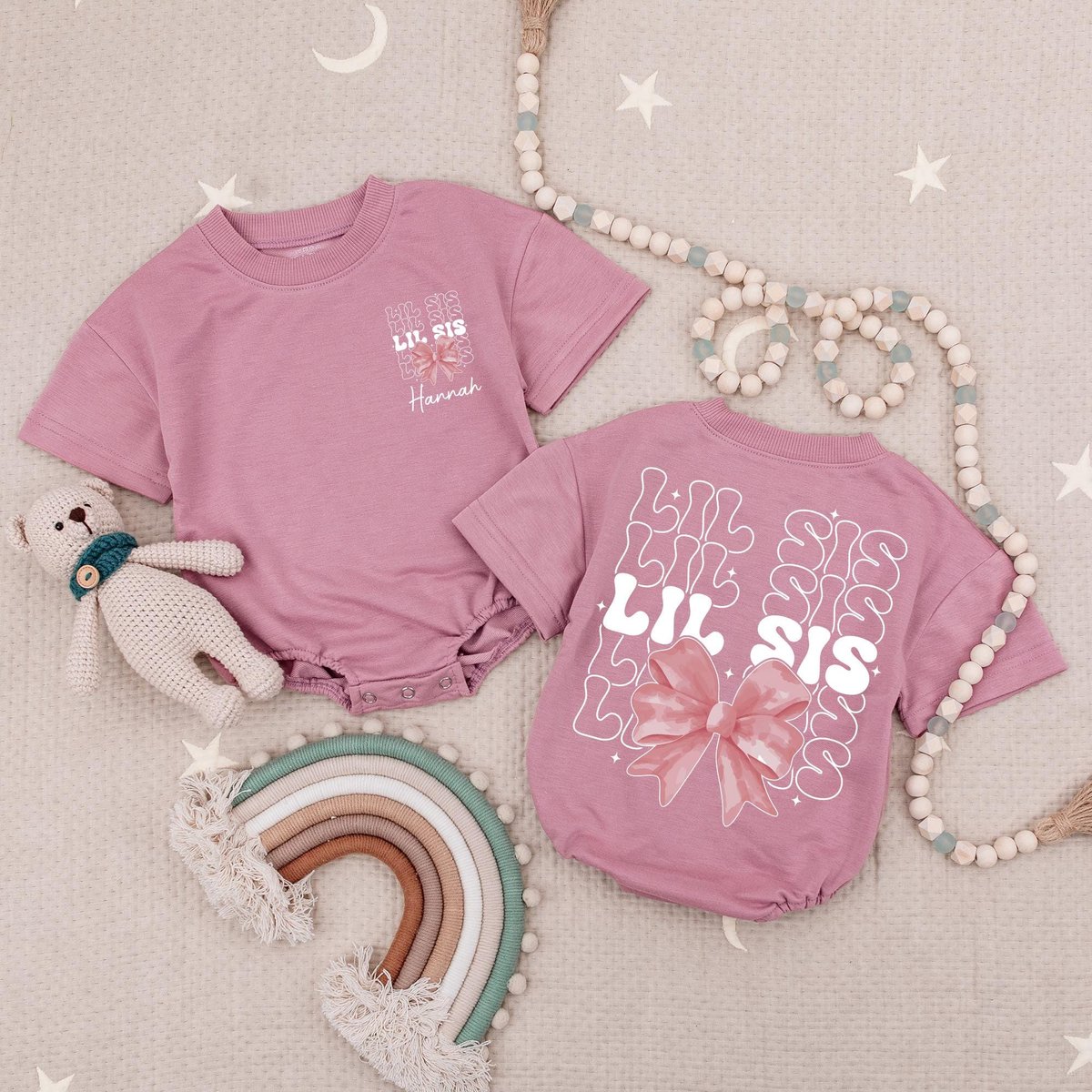 Personalized Name Little Sister Bubble Romper Lil Sis Pink Bow Baby Romper Custom Name Little Sis Ba