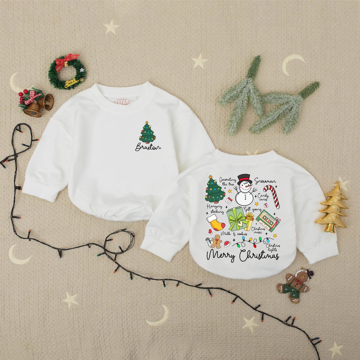 Personalized Name Merry Christmas Bubble Romper Cute Holiday Bodysuit Baby Shower Gift First Christm