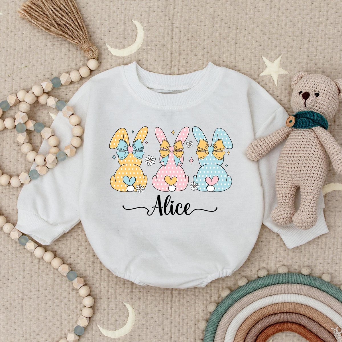 Personalized Name Easter Bunny Baby Romper Custom Name Spring Outfit Toddler Easter Bunny Rabbit Bod