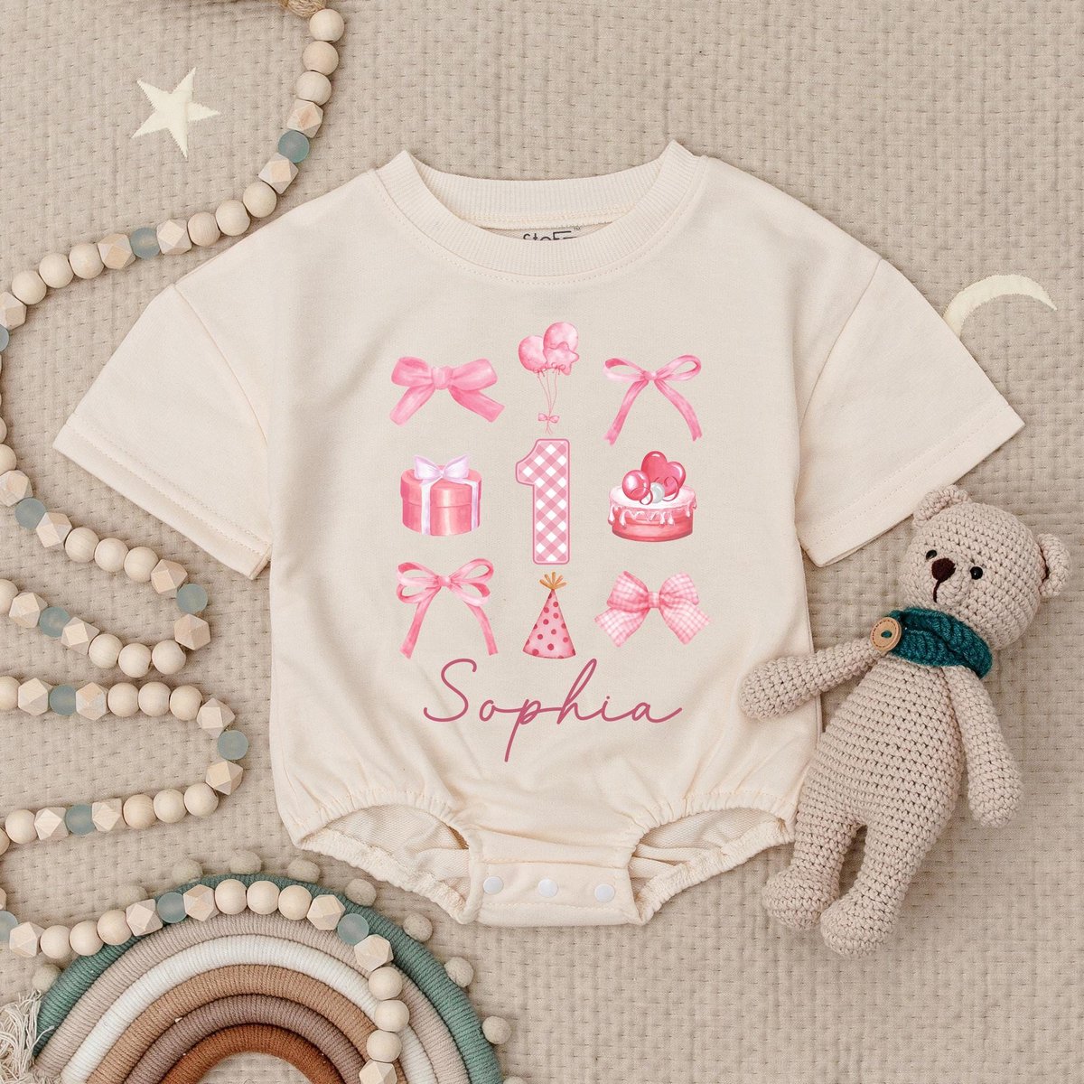 Personalized Name Cute Bow Birthday Baby Romper 1st Birthday Bodysuit For Baby Pink Bows Birthday Cu