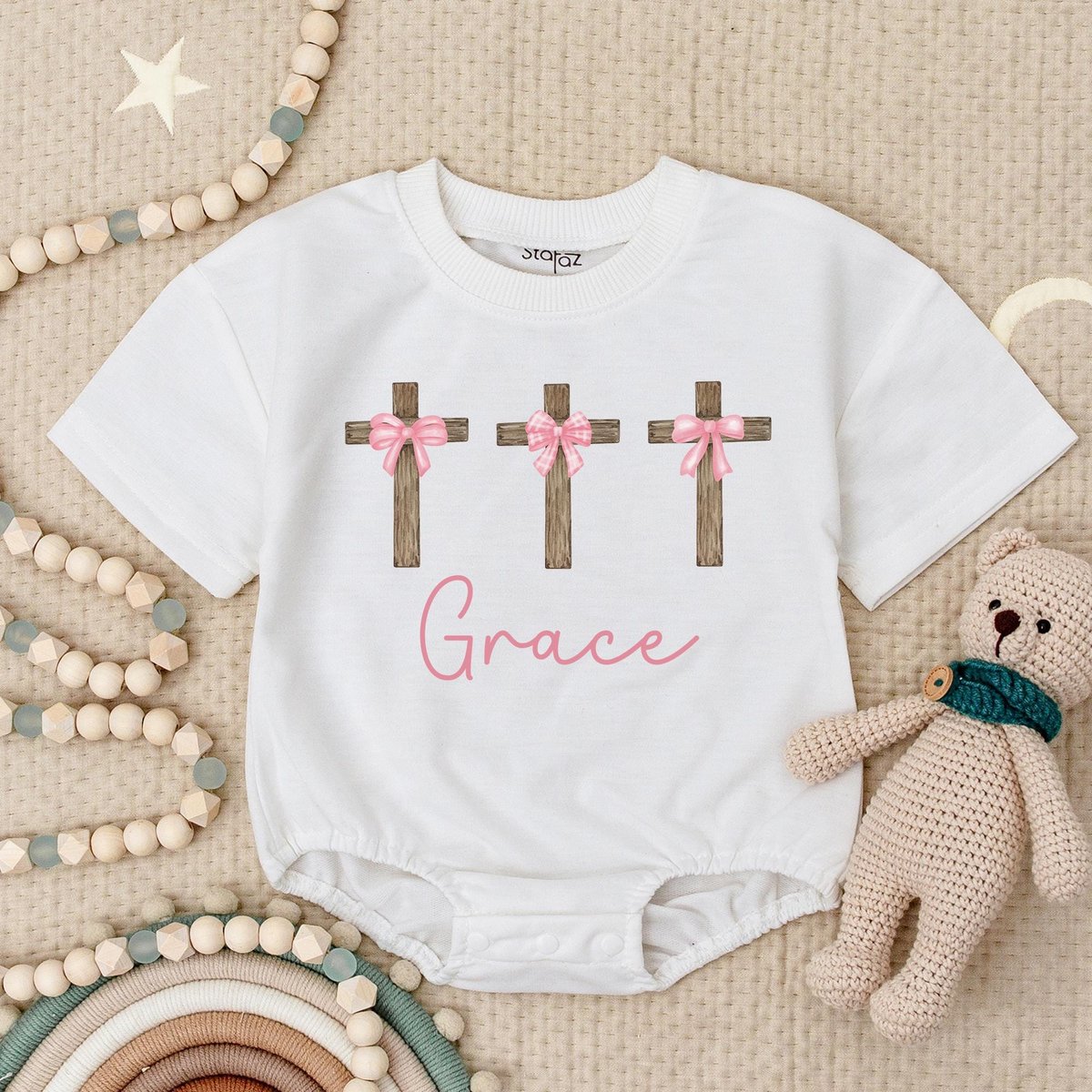 Personalized Girl Pink Easter Baby Romper Short Sleeves Jesus Bow Baby Bodysuit Christian Easter Rom