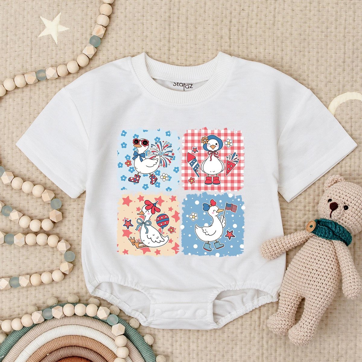 Personalized 4th of July Boy Girl Goose Baby Romper American Boy Girl Checkered Babysuit Patriotic G