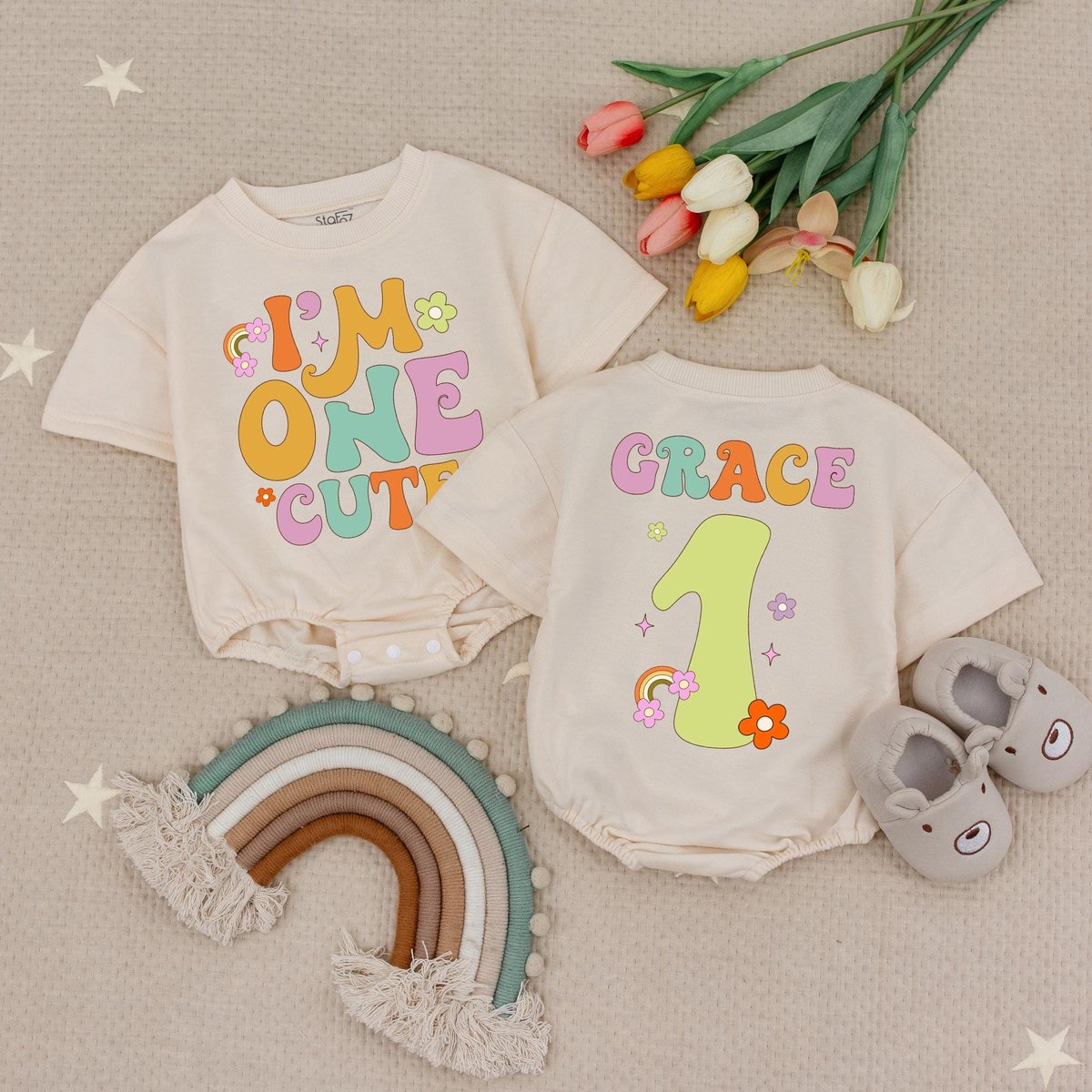 Im One Cute Baby Romper 1st Birthday Girl Babysuit 1st Birthday Outfit Retro Groovy Birthday Girl On