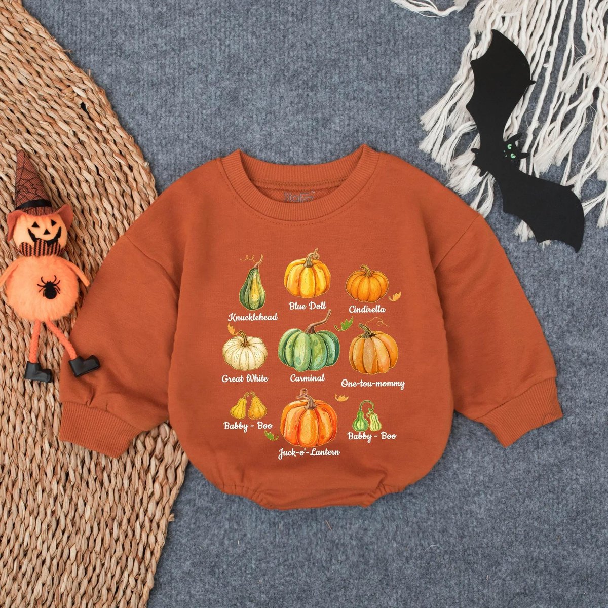 Halloween Pumpkin Patch Bubble Romper Fall Types of Pumpkins Baby Outfit Cozy Season Autumn Newborn 432