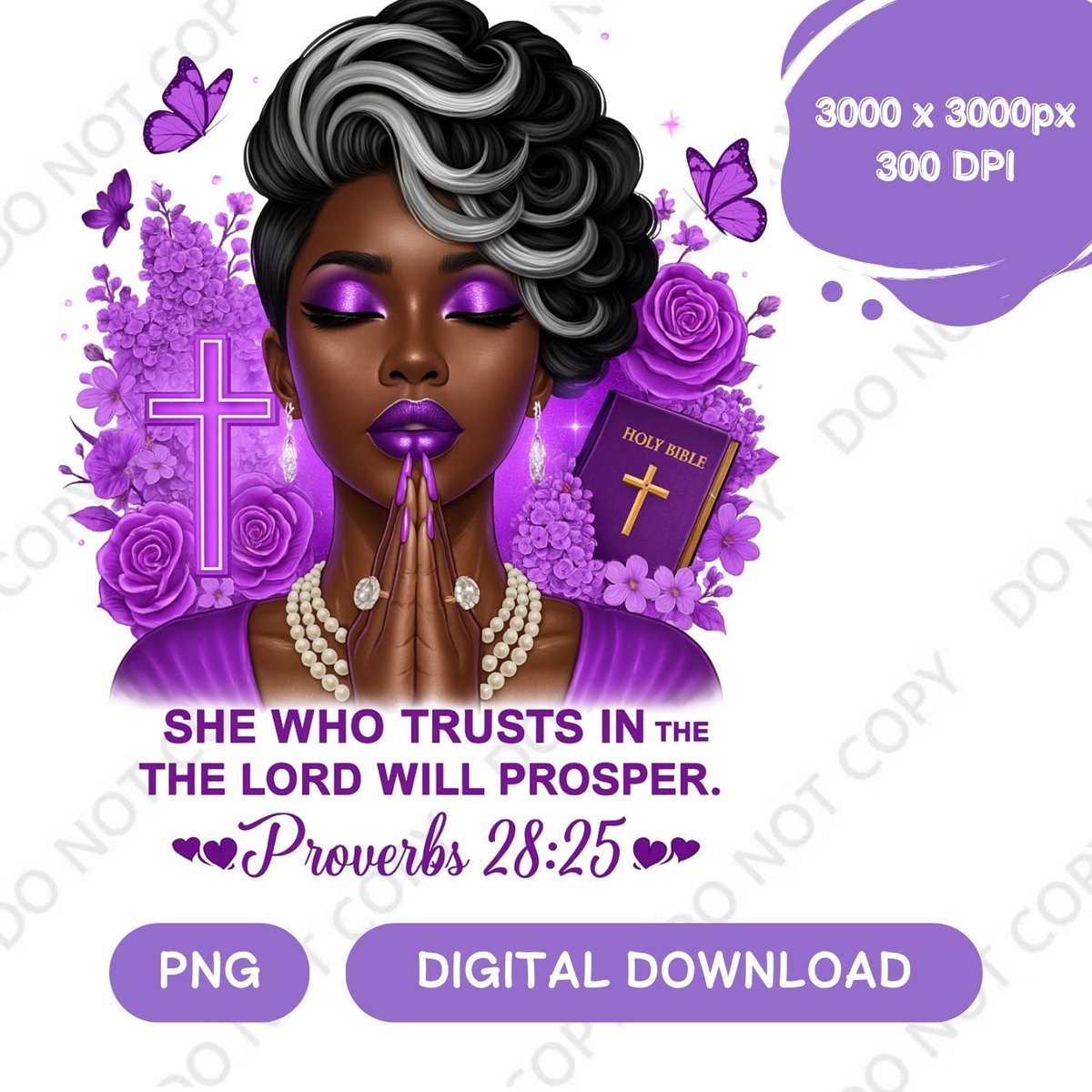 Christian Black Woman PNG Faith Quote Proverbs 28 25 Praying Bible Verses Purple Digital Download Su 433