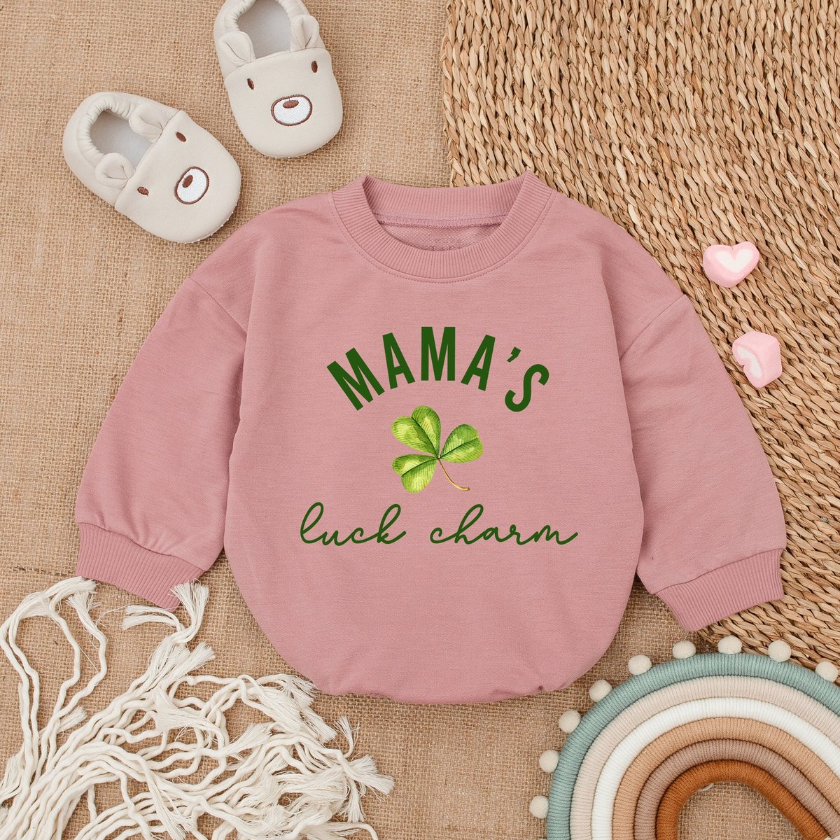Mama’s Little Charm Baby Romper St Patrick’s Day Bodysuit Natural Irish Baby Outfit Light Mauve
