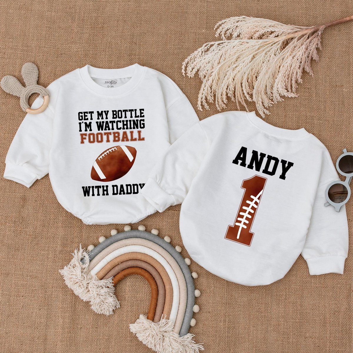 Get My Bottle I’m Watching Football with Daddy First Birthday Baby Bubble Romper Football 1st Birth 183