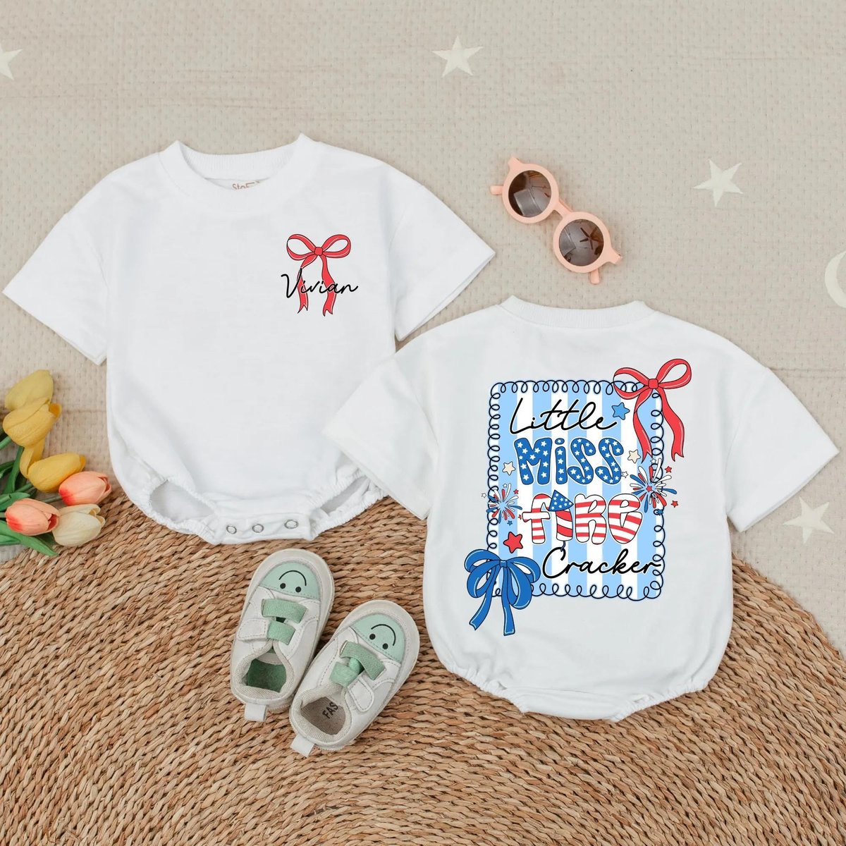 Custom Little Miss Firecracker Baby Girl 4th of July Short Sleeve Bubble Romper Red White Blue Toddle