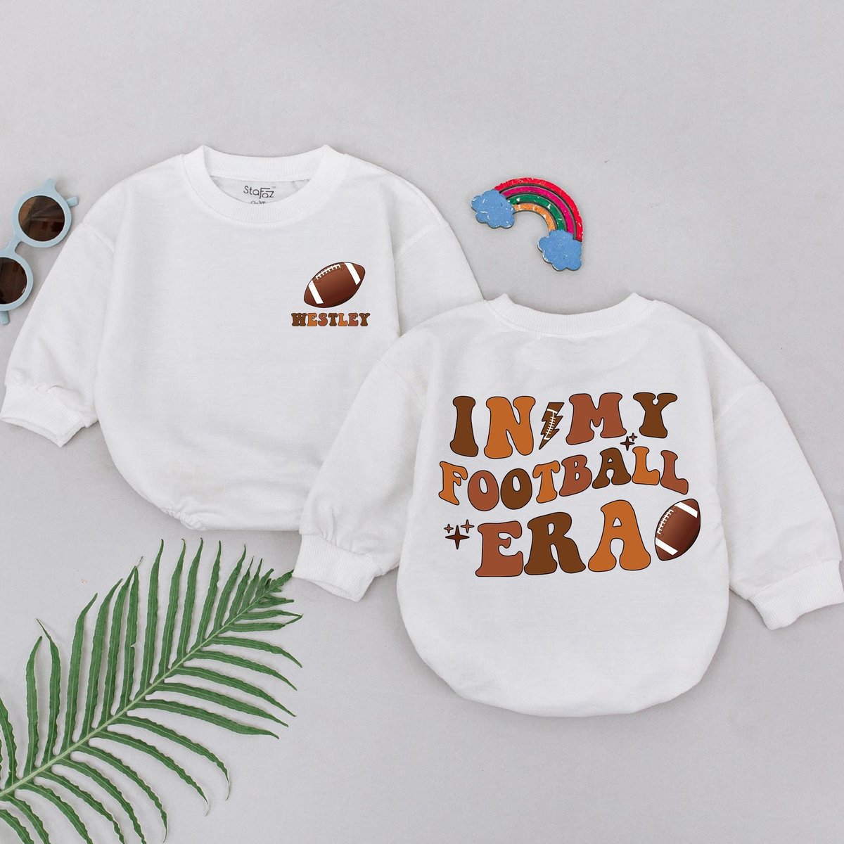 Personalized In My Football Era Romper Retro Football Bow Outfit Gameday Season Natural Bubble Baby
