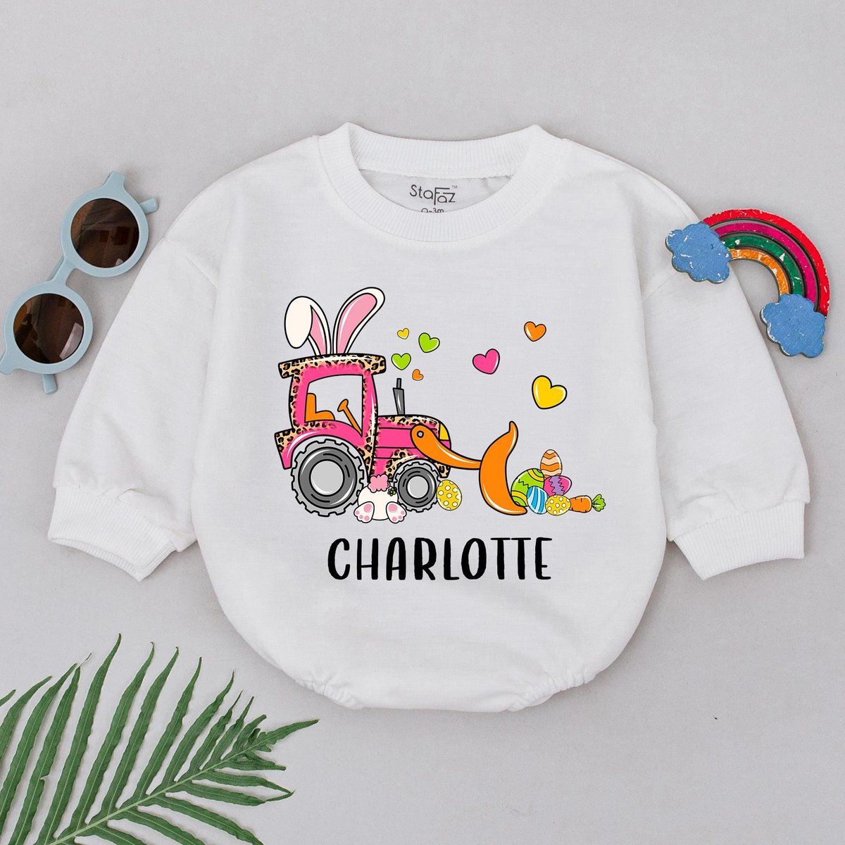 Personalized Eggs-Cavator Easter Romper Little Bunny Bodysuit Retro Easter Day Outfit Bunny Ears Bab