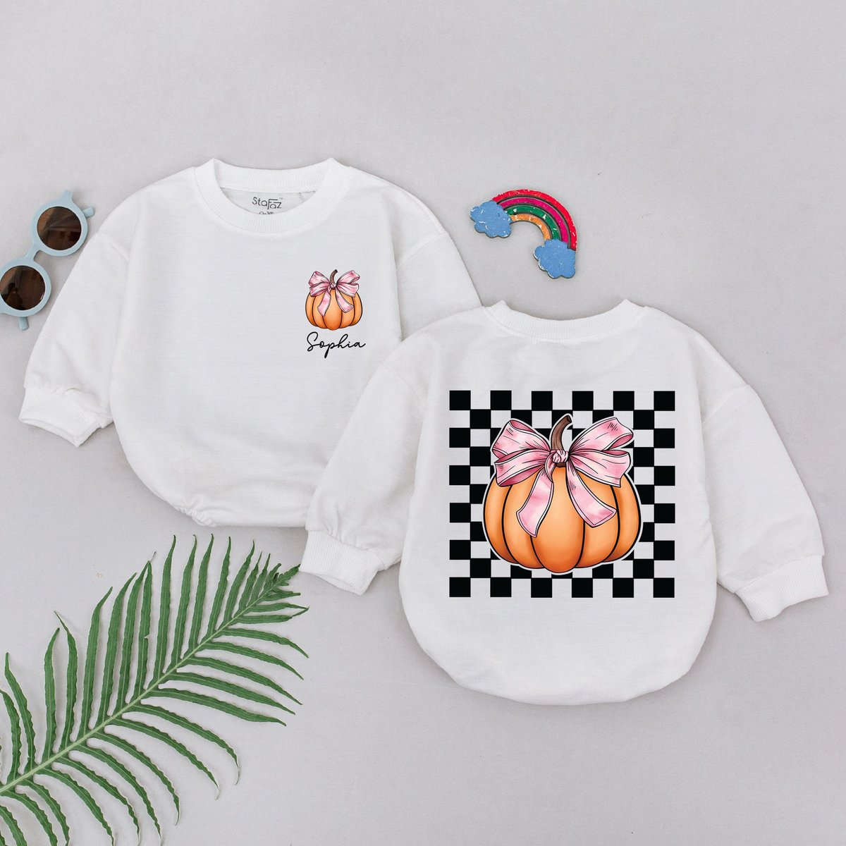 Personalized Checkered Pumpkin Romper Custom Name Fall Outfits Baby Shower Gift Pumpkin Spice Outfit