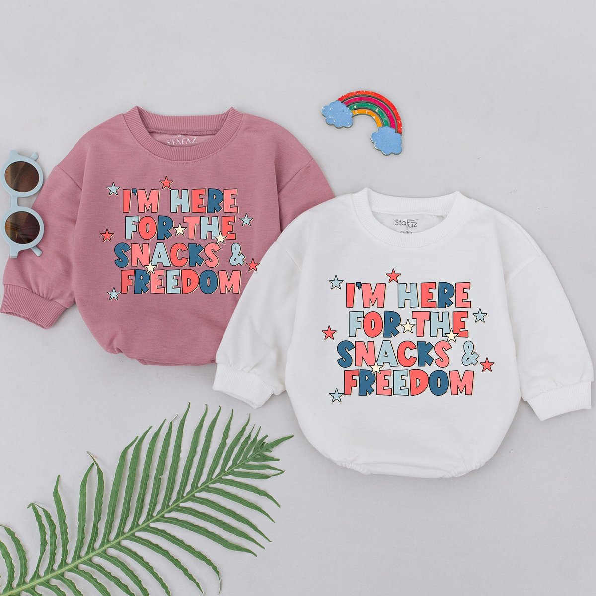 I’m Here for the Snacks and Freedom Romper 4th Of July Romper America Patriotic Bodysuit Independen