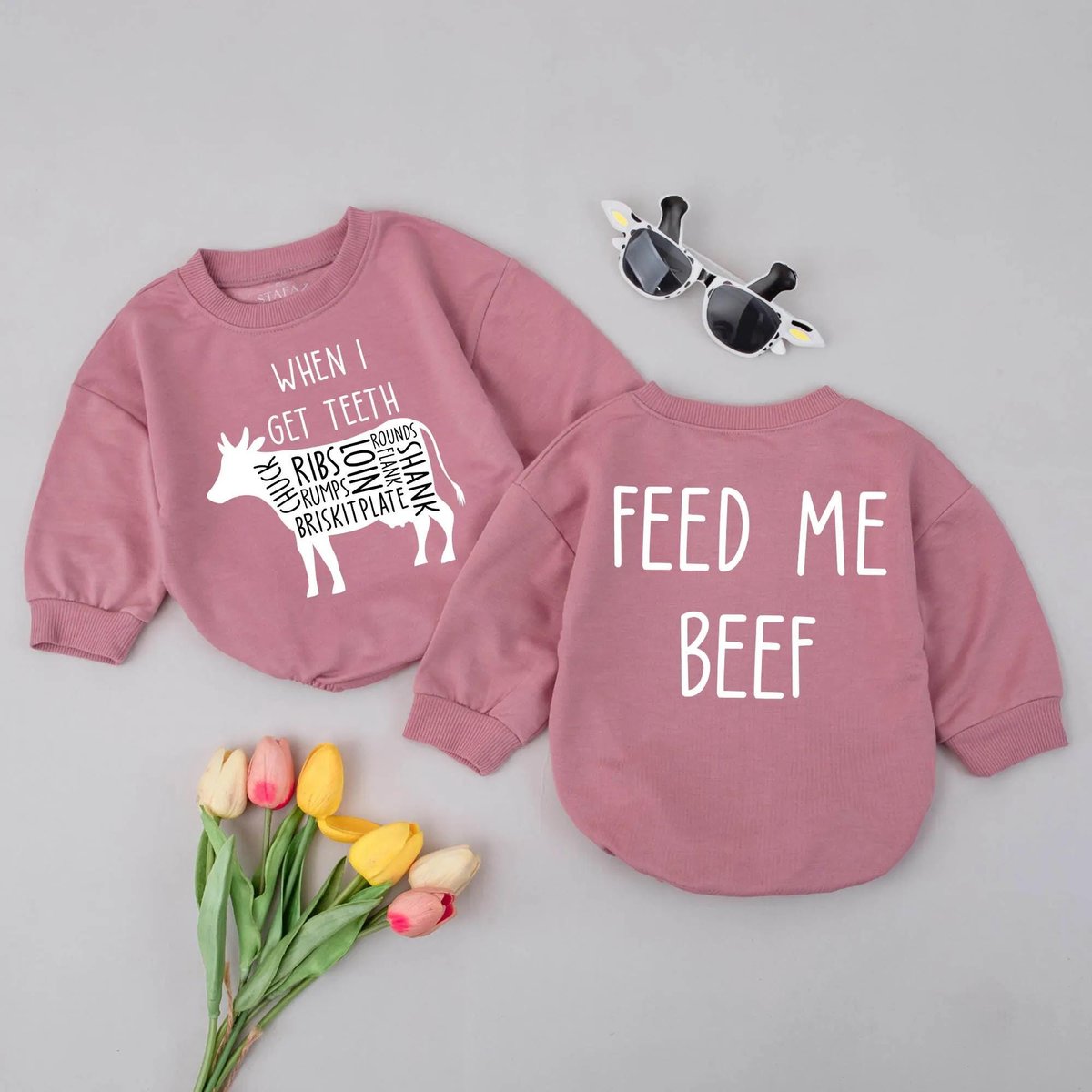 When I Get Teeth Feed Me Beef Bubble Romper Funny Cow Infant Outfit Cute Farm Baby Bodysuit Baby Sho 435