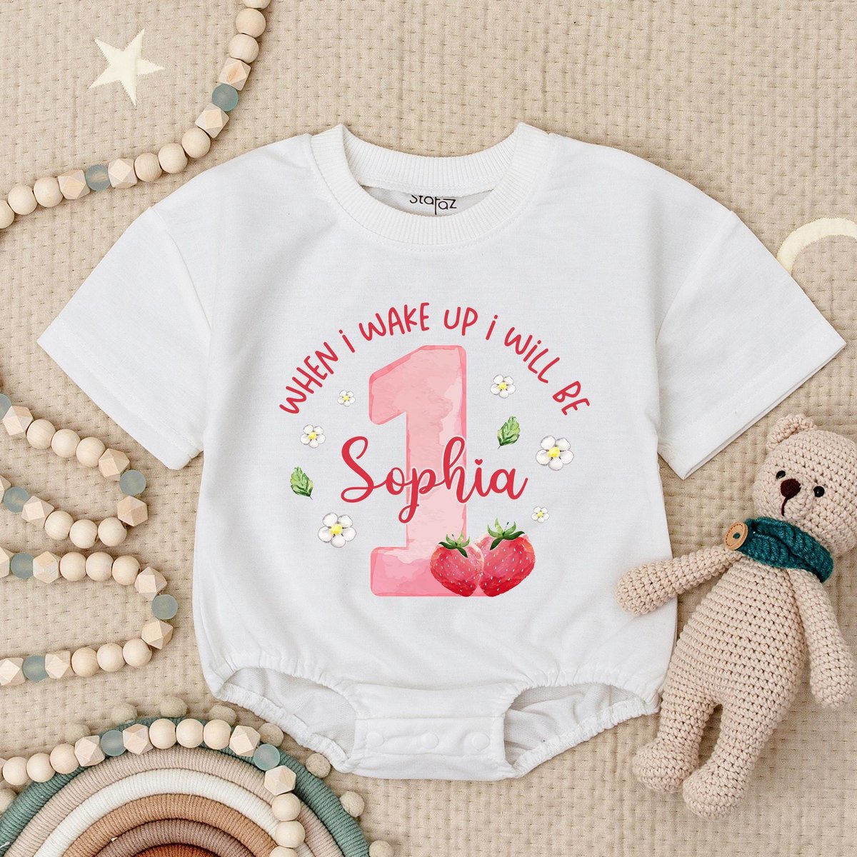 When I Wake Up I Will Be One Baby Romper Girl’s First Birthday Strawberry Babysuit Custom Berry Fir