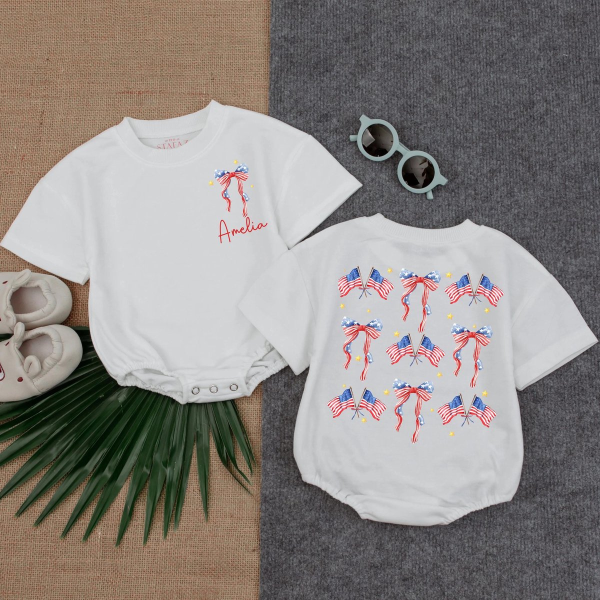 Custom Name American Flag Bow T Shirt Bubble Romper Short Sleeve Summer Clothes Personalized Baby Ro 430
