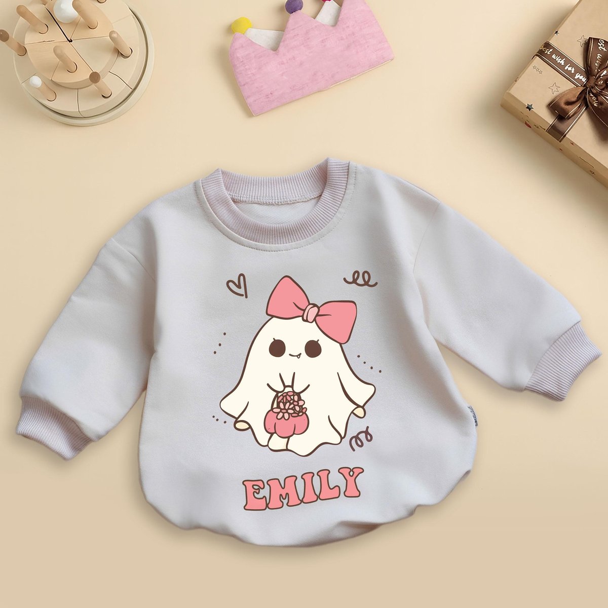 Custom Kids Halloween Romper Cute Retro Ghost Pink Bow Bodysuit Spooky Ghoul Coquette Pastel Bow Bab 436