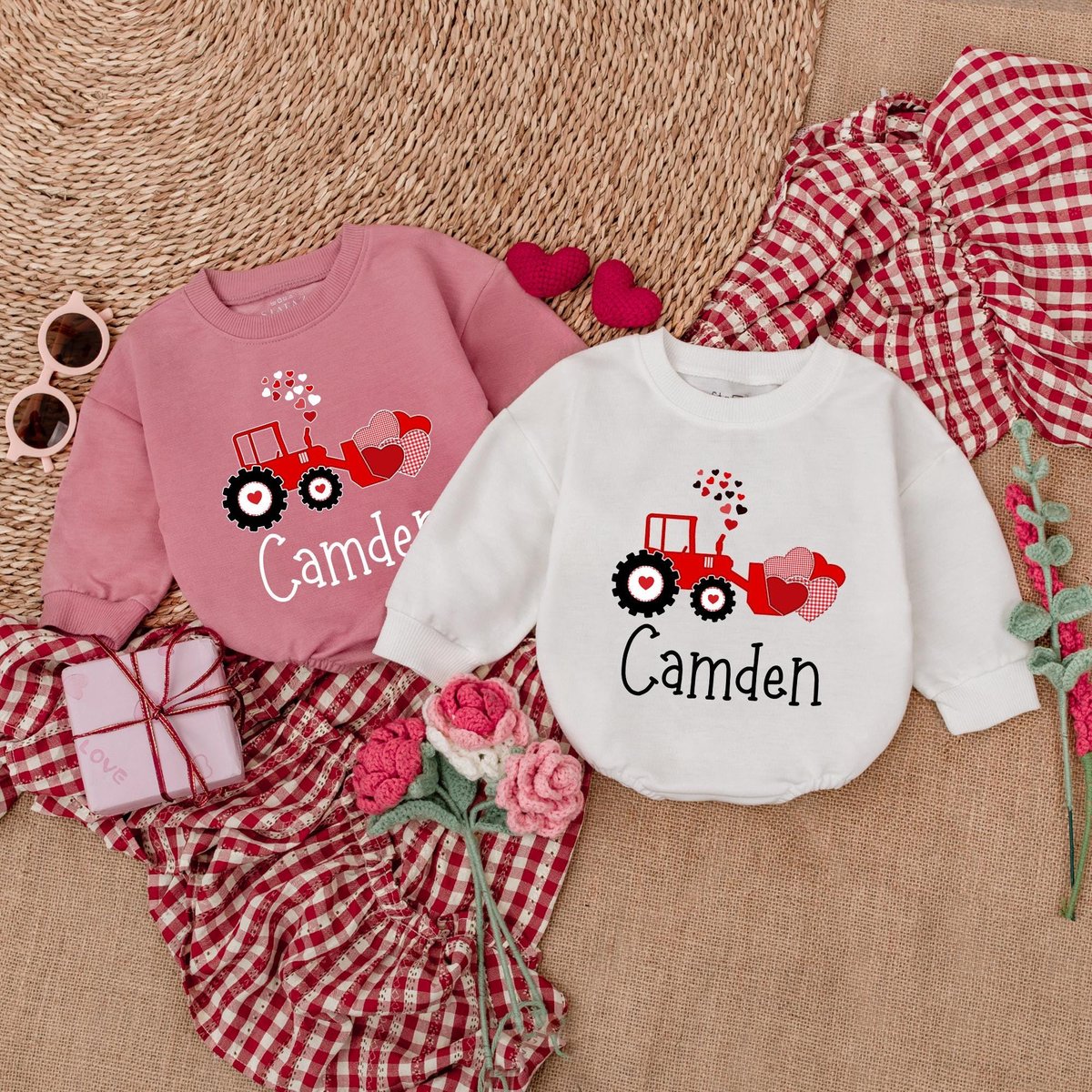Personalized Valentine Red Tractor Baby Romper Baby Boy Valentine Bodysuit Custom Name Valentine’s 185