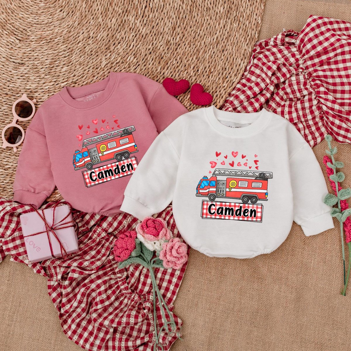Personalized Valentines Fire Truck Romper Valentines Day Bodysuit Valentine Bubble Romper First Vale 183