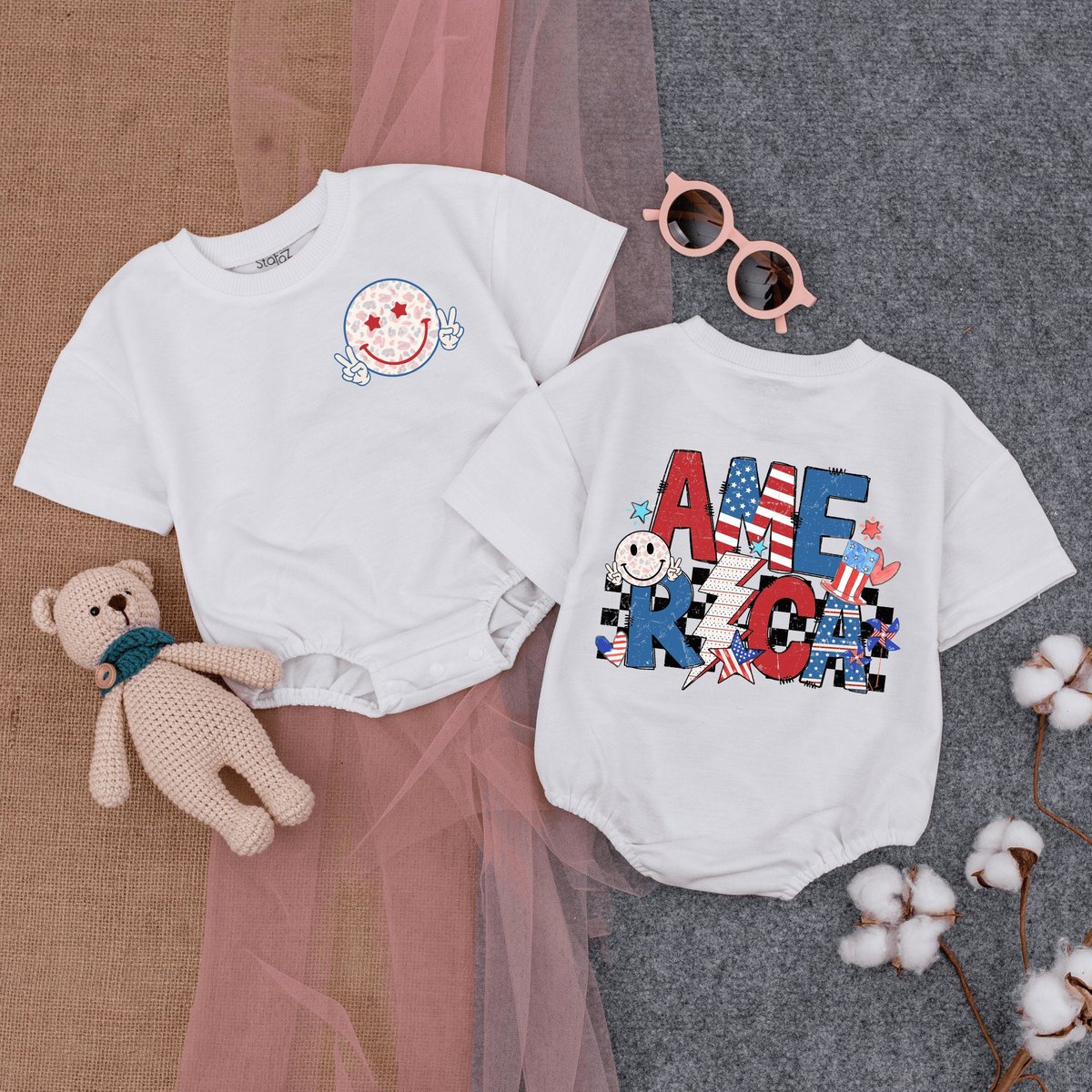 Retro 4th Of July America Smiling Face Romper Short Sleeve Cute Fourth July Baby 1st 4th Of July F 169