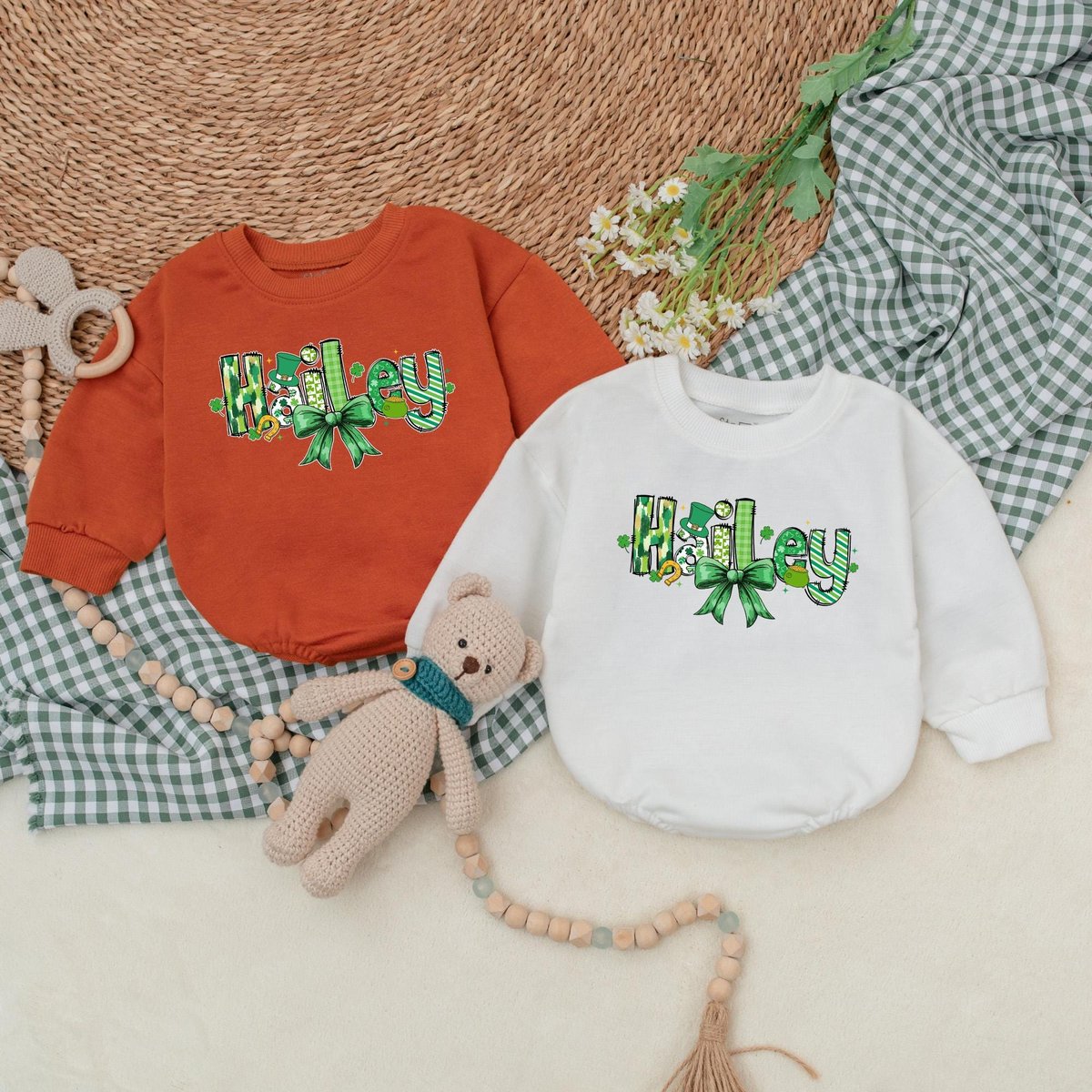 Personalized St Patrick’s Day Baby Romper Custom Name Patrick Bow Bodysuit Baby Patrick’s Day Outf 185